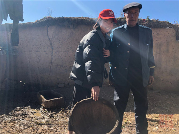 尔几十古(右)和他孙女向记者展示曾经用来背水的木桶。