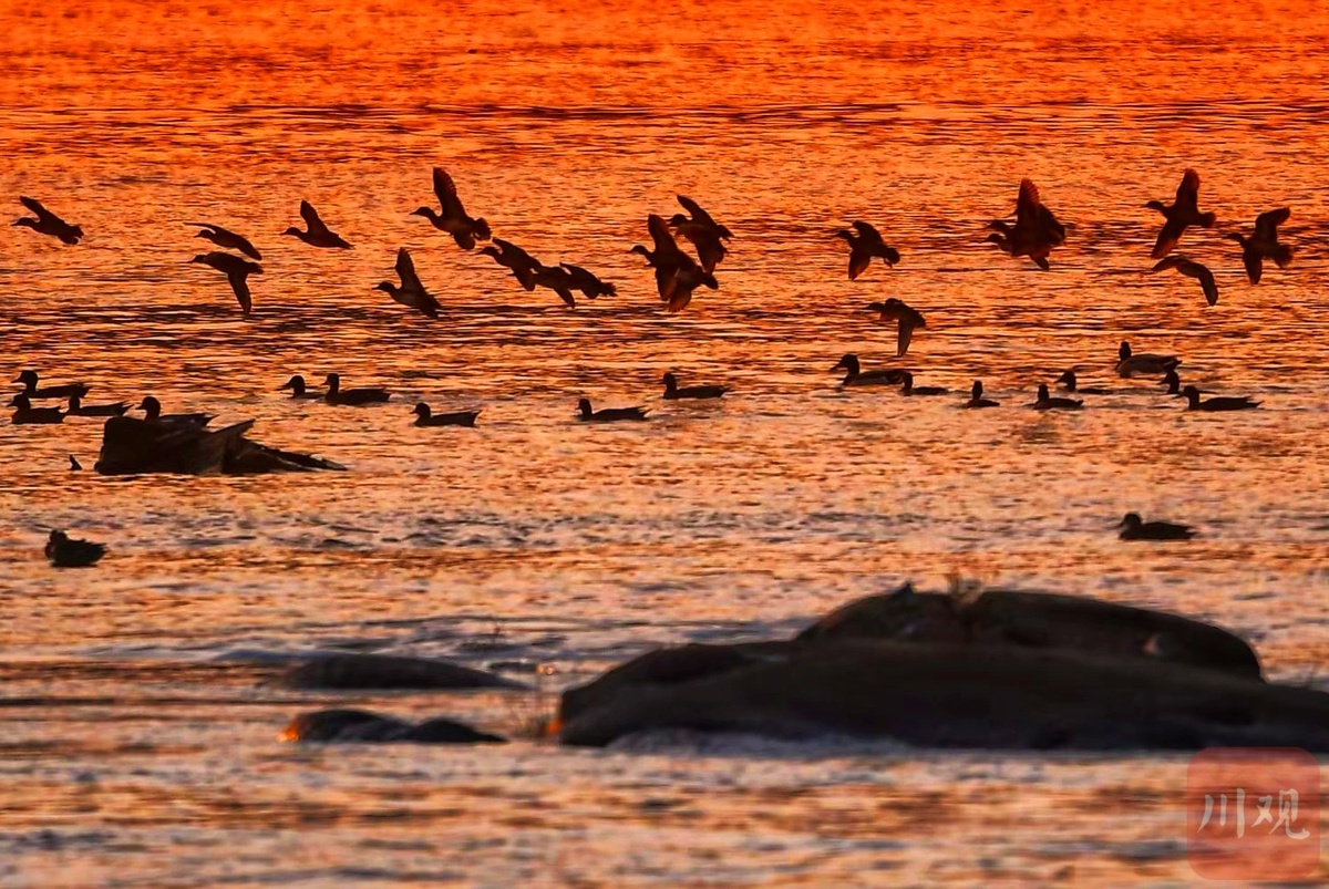 野鸭群生活在泸州市长江上的滩涂地上