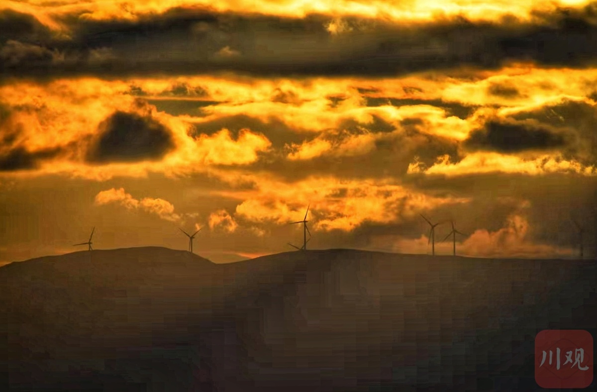 夕阳下的凉山州的风力发电机组