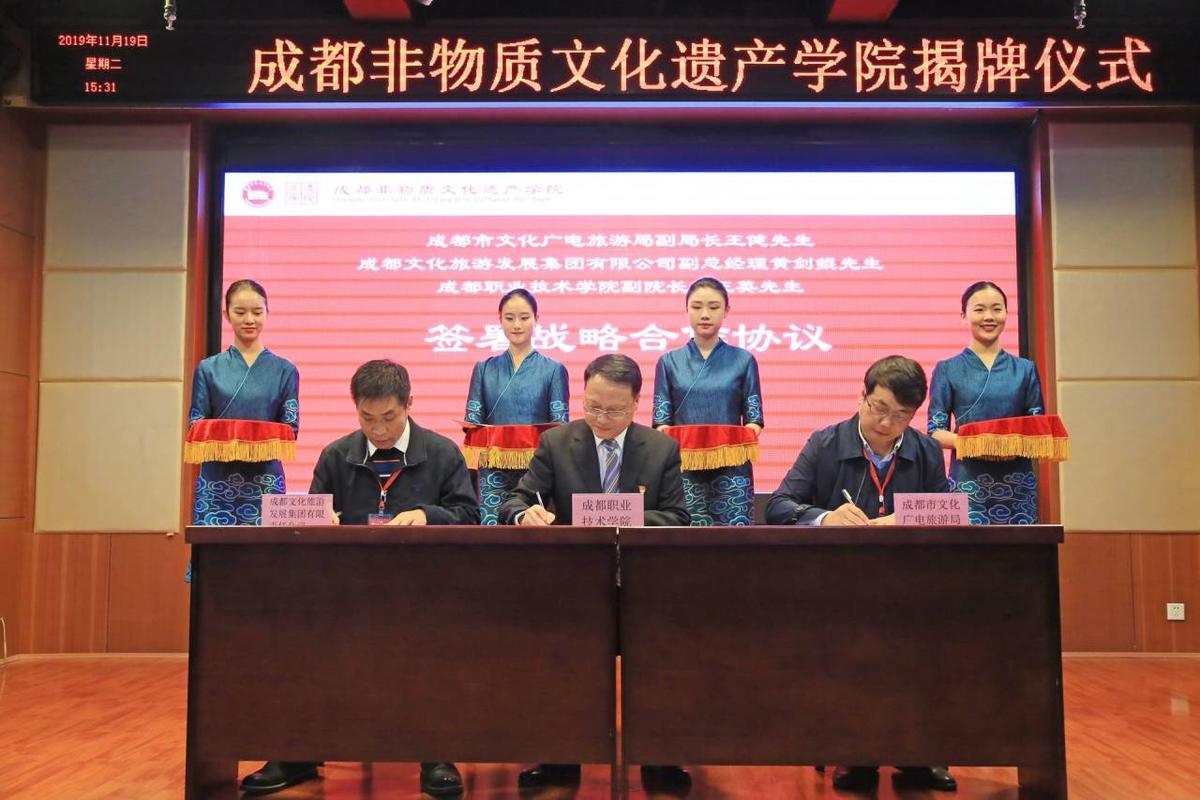 成都职业技术学院与成都市文化广电旅游局、成都文旅集团基于各自在非物质文化遗产保护与传承、文化旅游产业开发、职业人才培养等方面的优势,本着“互惠、互利、稳定、恒久、高效、优质”的合作精神,结成深度的战略合作伙伴关系,在现场签署了战略合作协议,各方一致表示将从技艺革新、路径融合、人才培养、产品研发、业态孵化和产业赋能等方面解决非物质文化遗产活态传承的理念、方法和路径问题,从而全面提升成都市非物质文化遗产传承与保护工作水平。