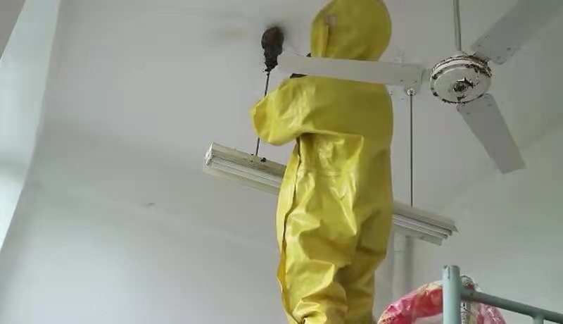 随后,一名队员穿戴好防蜂服后,进入房间后紧闭门窗,禁止无防护装备人员进入现场,随即拿出杀虫剂对马蜂进行消灭,并对蜂窝进行铲除喷洒药剂,防止马蜂再次筑巢,铲除完后对现场消灭后的马蜂进行清理,防止还有活的马蜂伤害师生,确认安全后,再次对房间进行喷药并关闭房间,告知学校老师近段时间不要进入房间,如果发现其他地方有马蜂窝或者困难及时告诉我们,千万不要轻易摘除,避免被蜇伤,我们会第一时间到学校帮助解决。