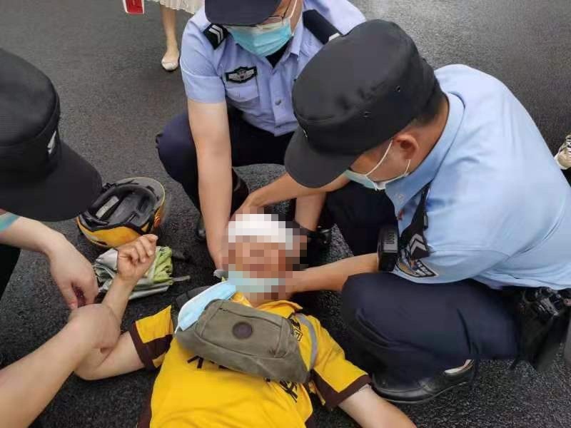 在现场,民警发现一名外卖小哥与电瓶车倒在地上,随即跑步上前进行现场查看。民警查看发现,外卖小哥头部后脑勺出血,民警迅速汇报情况并请求支援,并拨打了120急救电话。三名支援警力达到现场后,为确保伤者的生命安全,现场警员分工协作,临时负责起了道路交通的秩序维护以及群众疏散等系列工作。