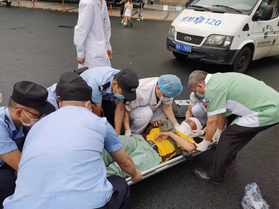 为尽快对伤者止血,现场警员利用日常所学的简单急救操作,果断在现场为伤者进行头部包扎,第一时间为伤者进行了止血,进一步等待医护人员到场救治。期间,现场警员通过公安信息平台第一时间确认了伤者的身份信息,随后电话联系到伤者的家人请他们不要过分担心,并告知其到成都市第一人民医院急诊中心寻找伤者,在电话里伤者家属一直表示对我们公安机关的感激之情,连连说着感谢。120达到后,我们配合急救人员将伤者抬上担架,送上救护车,快速的恢复了现场秩序