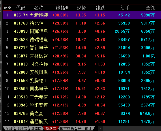 受此消息影响,新三板精选层个股大幅高开,五新隧道30%涨停,拾比佰、同辉信息、德瑞锂电等多股涨逾20%。与此同时,A股创投概念大涨,创业黑马、中关村、城建发展等多股开盘即涨停。