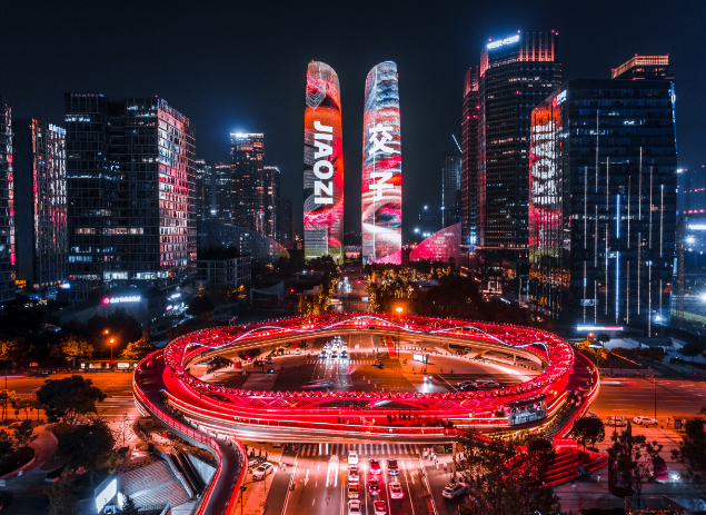 在城市设计学中,建筑物与视点的距离(D)与建筑高度(H)之比D/H=2、视角为27°时,则可以整体地看到建筑物,被认为是观察建筑物整体的最佳视角,“因此,我们想到了在此处创建一个能够多维度观赏交子双塔的都市文化地标、交子环。”交子环启用后,形成了一个圆形的空中连廊,观赏品质提升、商圈价值也飞升,赢得了多重效应。