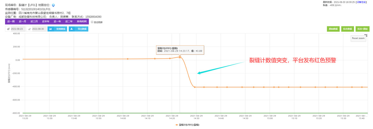 裂缝计监测数据反馈,坡体中部裂缝进入加速变形阶段,仅仅用了20分钟,裂缝宽度被拉开超过40厘米,监测预警平台立即向监测人员发布预警信息。