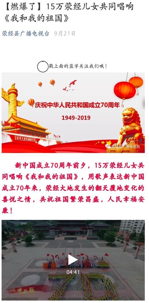 戳图看作品↑↑↑ 荥经县融媒体中心:【燃爆了】15万荥经儿女共同唱响《我和我的祖国》