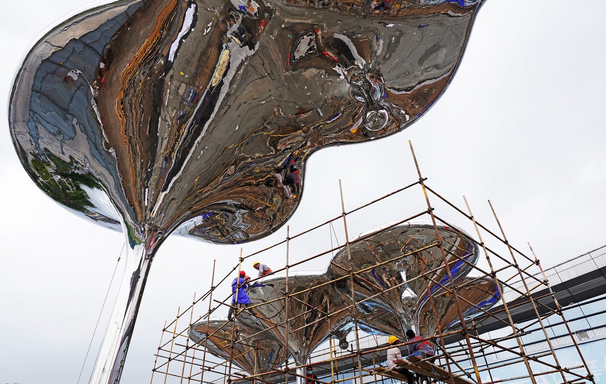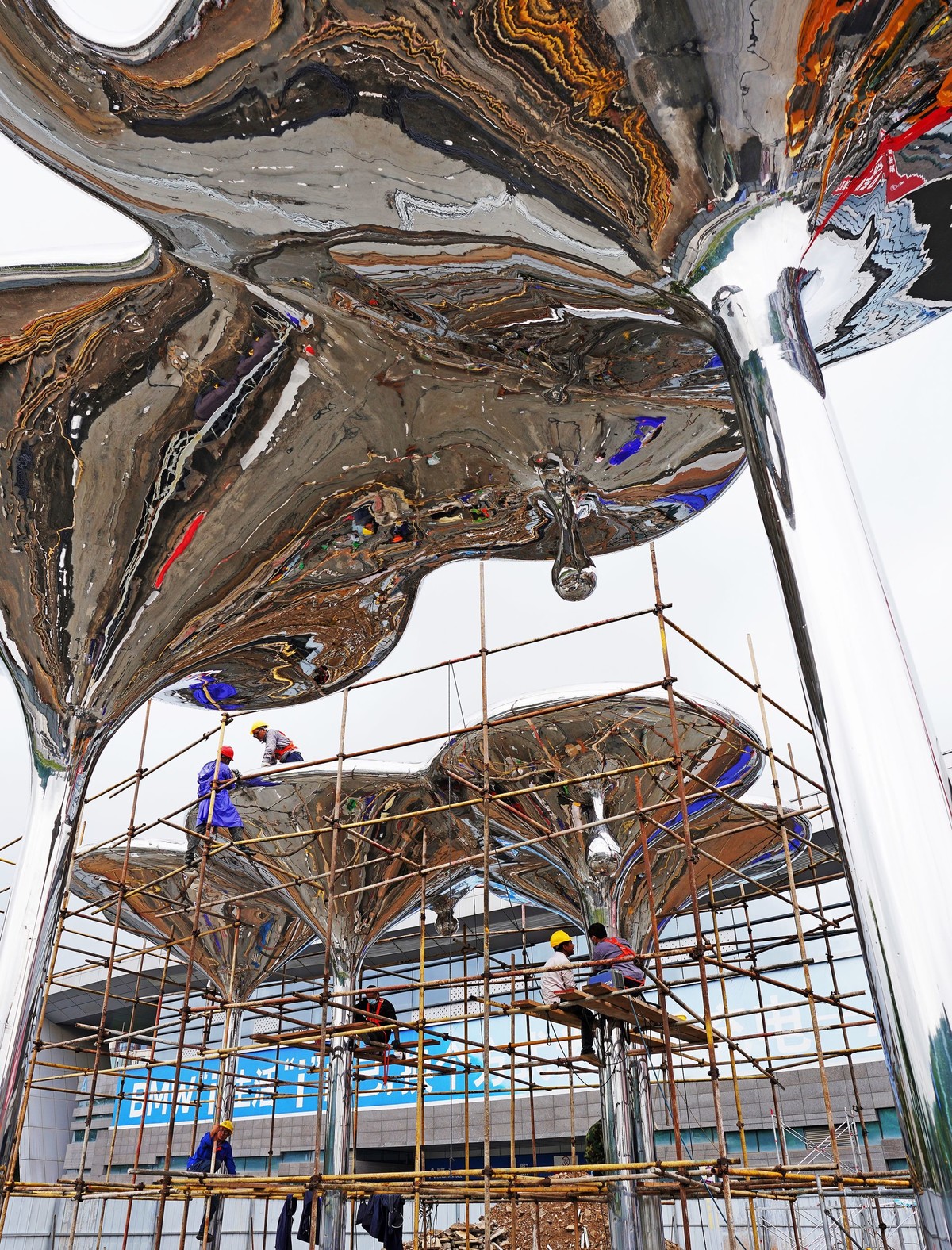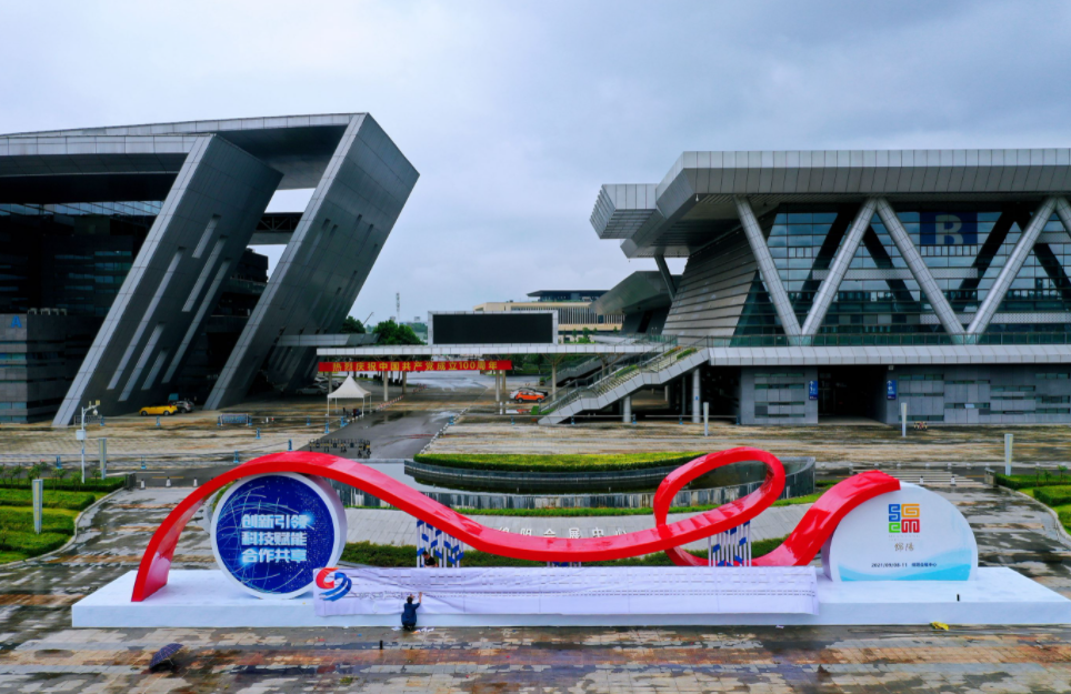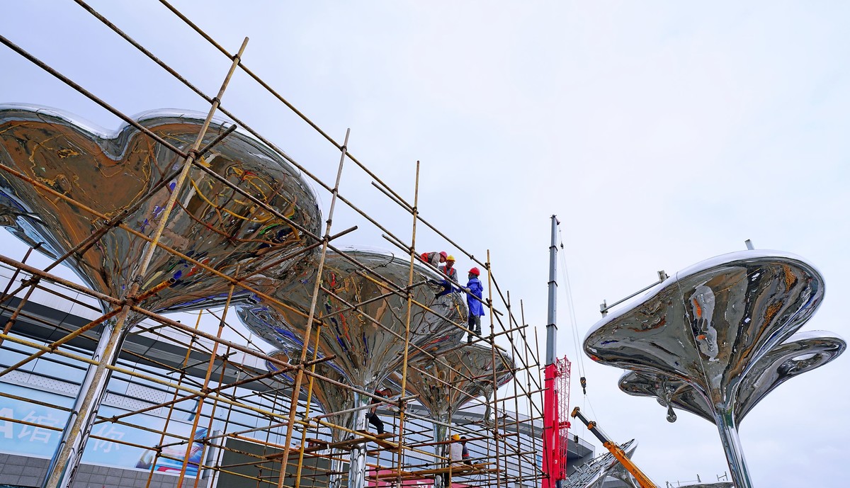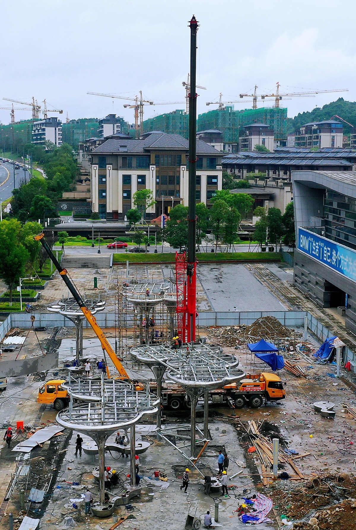 为迎接即将到来的第九届中国(绵阳)科技城国际科技博览会,绵阳会展中心附近已“换上新装”。9月2日,记者在第九届科博会举办地——绵阳会展中心看到,上百名工人和数十台大型机械正紧张施工,会展中心正大门前,工人们正在布置第九届科博会标志,不远处的广场上,数台大型吊装机械正在吊装“星云之伞”雕塑,17时许,雕塑主体部分已全部吊装到位。