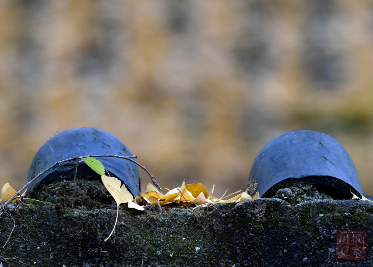11月25日,在成都崇州罨画池,一片片金黄色的银杏叶落在瓦片上。