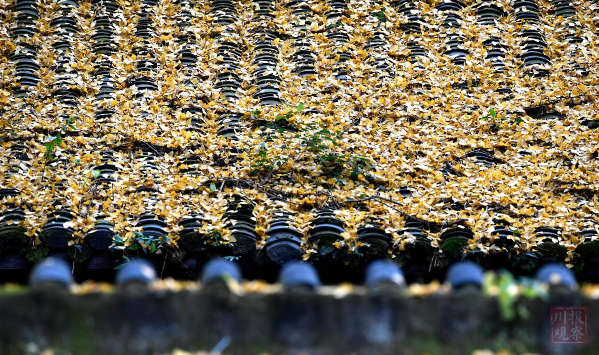 11月25日,在成都崇州罨画池,一片片金黄色的银杏叶落在房顶上。