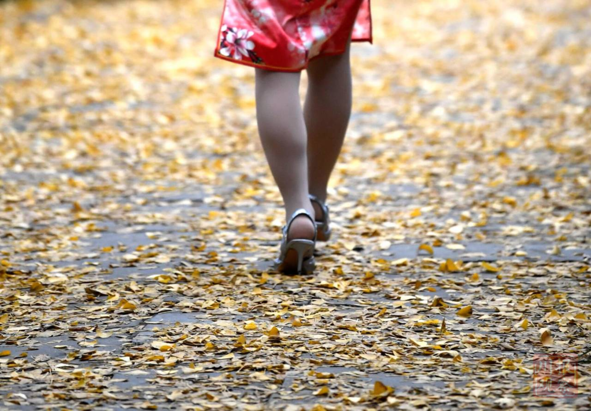 11月25日,在成都崇州罨画池,一名女孩从落满银杏叶的地面上走过。