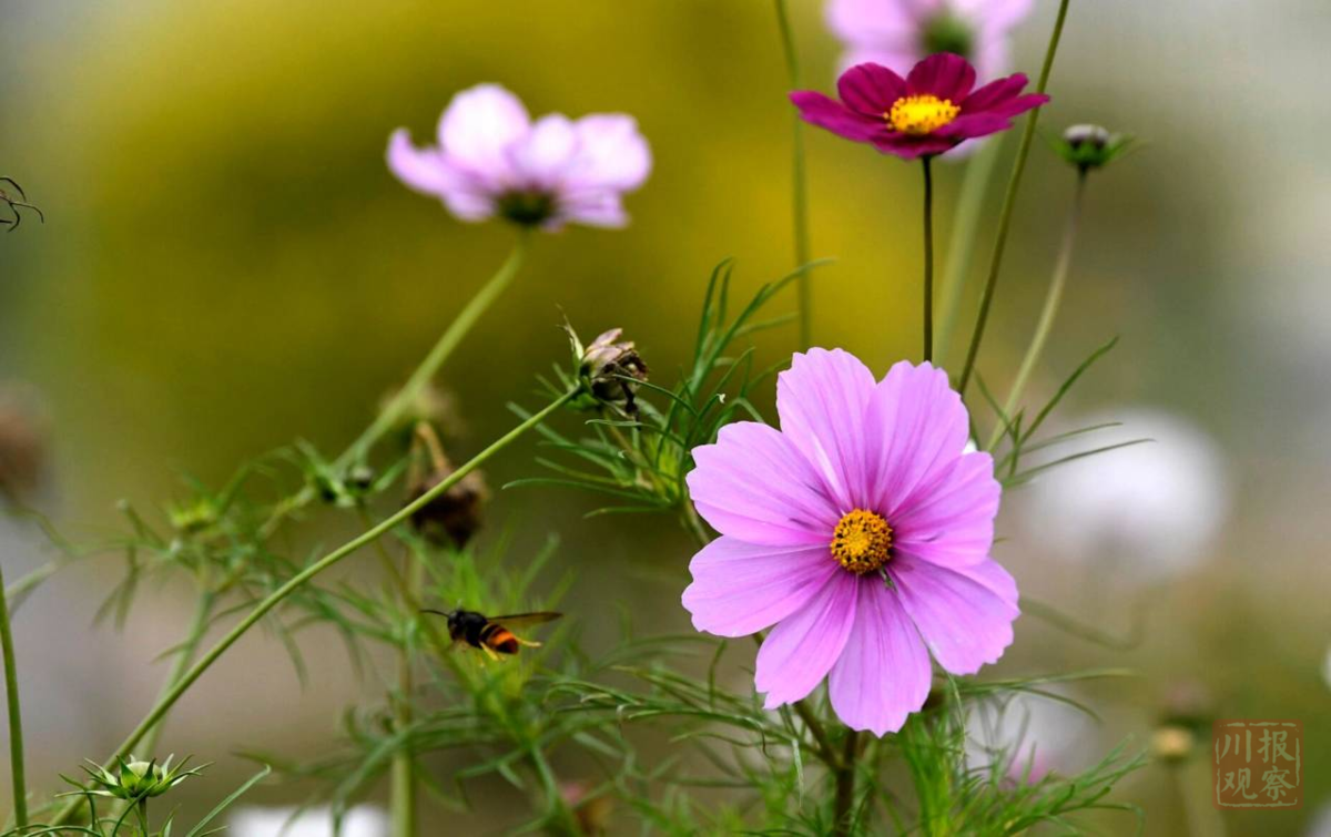 11月25日,在成都绕城一服务区,停车场上的格桑花争相开放,吸引一只蜜蜂采蜜。