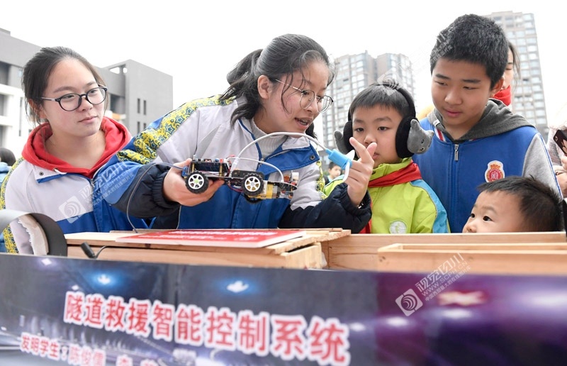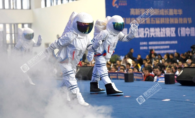 开幕式上,致敬航天人的太空舞《飞天舞者》带领现场观众探秘宇宙,领略奇美的世界。在竞赛活动和体验活动上,成都市中和中学展出的隧道救援控制系统、电子科技大学实验中学附属小学展出的手工钢琴、成都高新区西芯小学展出的会飞的足球……一场充满“未来感”的科技盛宴吸引众多小学生和家长们现场围观。