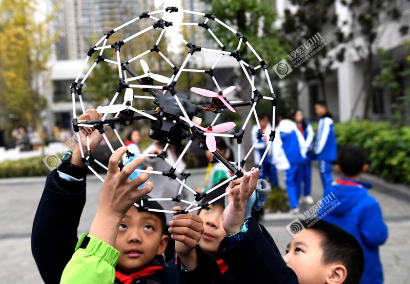 成都高新区西芯小学的小学生展示一款会飞的足球。