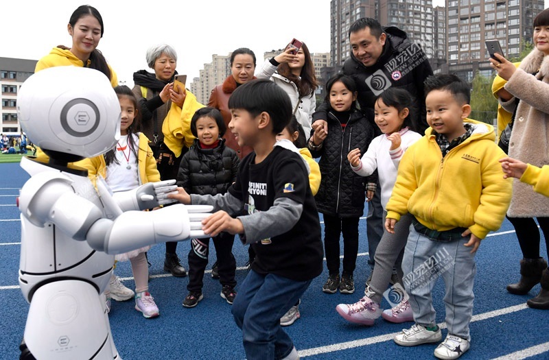 伴随着音乐,孩子们和一款会跳舞的机器人一起共舞。