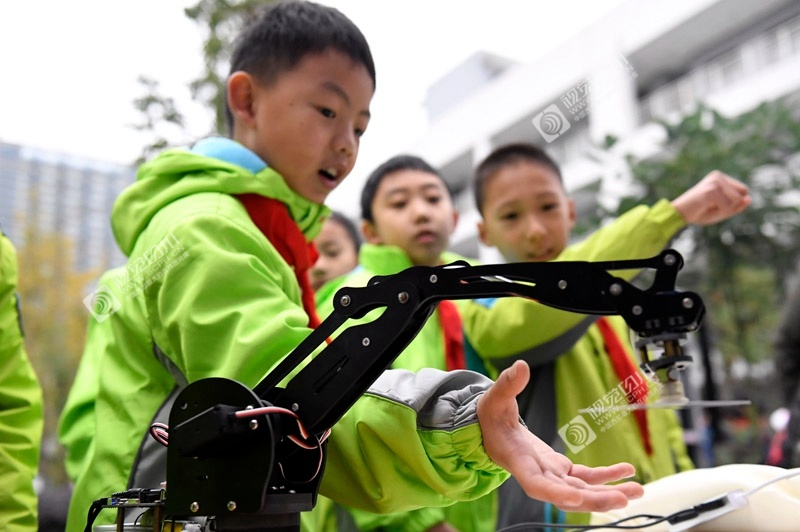 现场展出的一款气泵机械手吸引小学生前来体验。