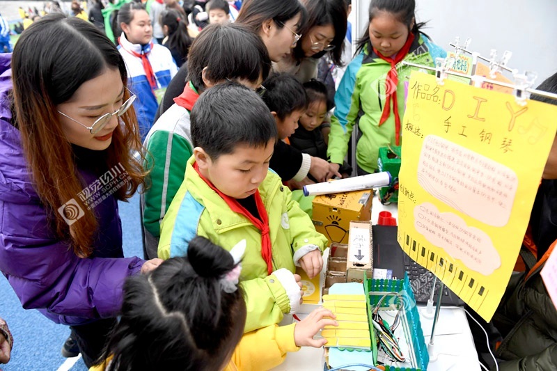 电子科技大学实验中学附属小学展出的手工钢琴吸引孩子们前来体验。