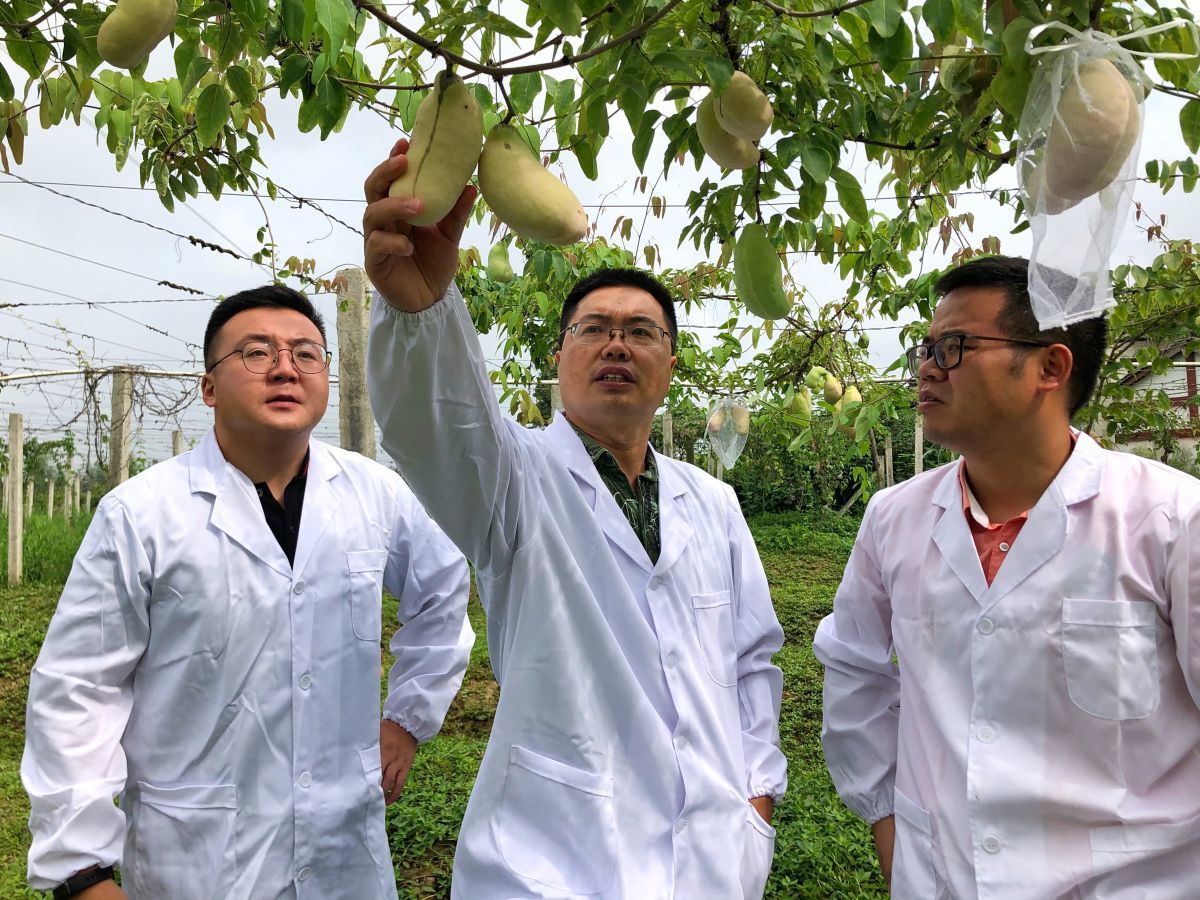 罗培高教授(中)与团队查看八月瓜长势 杜铠兵 摄