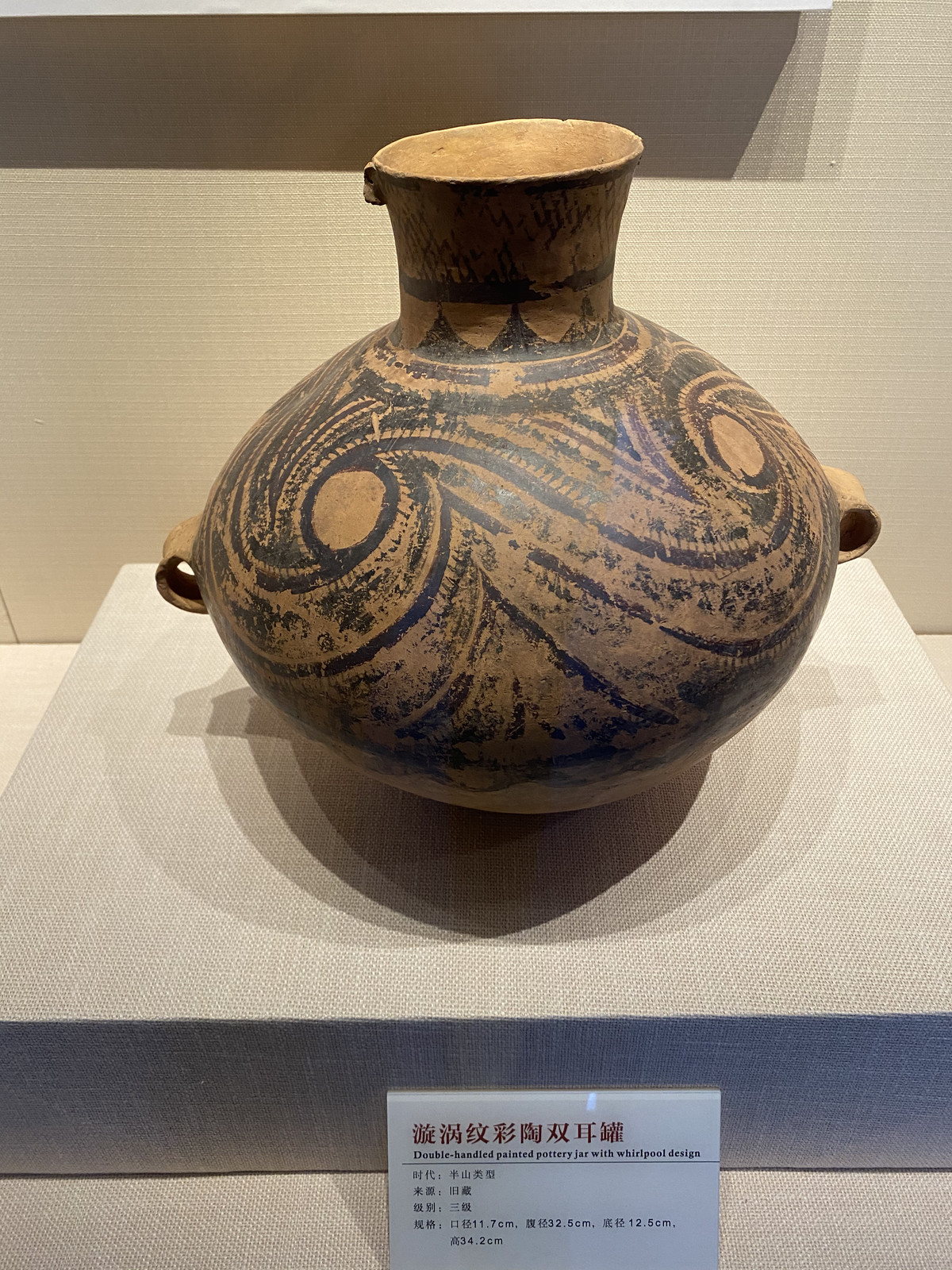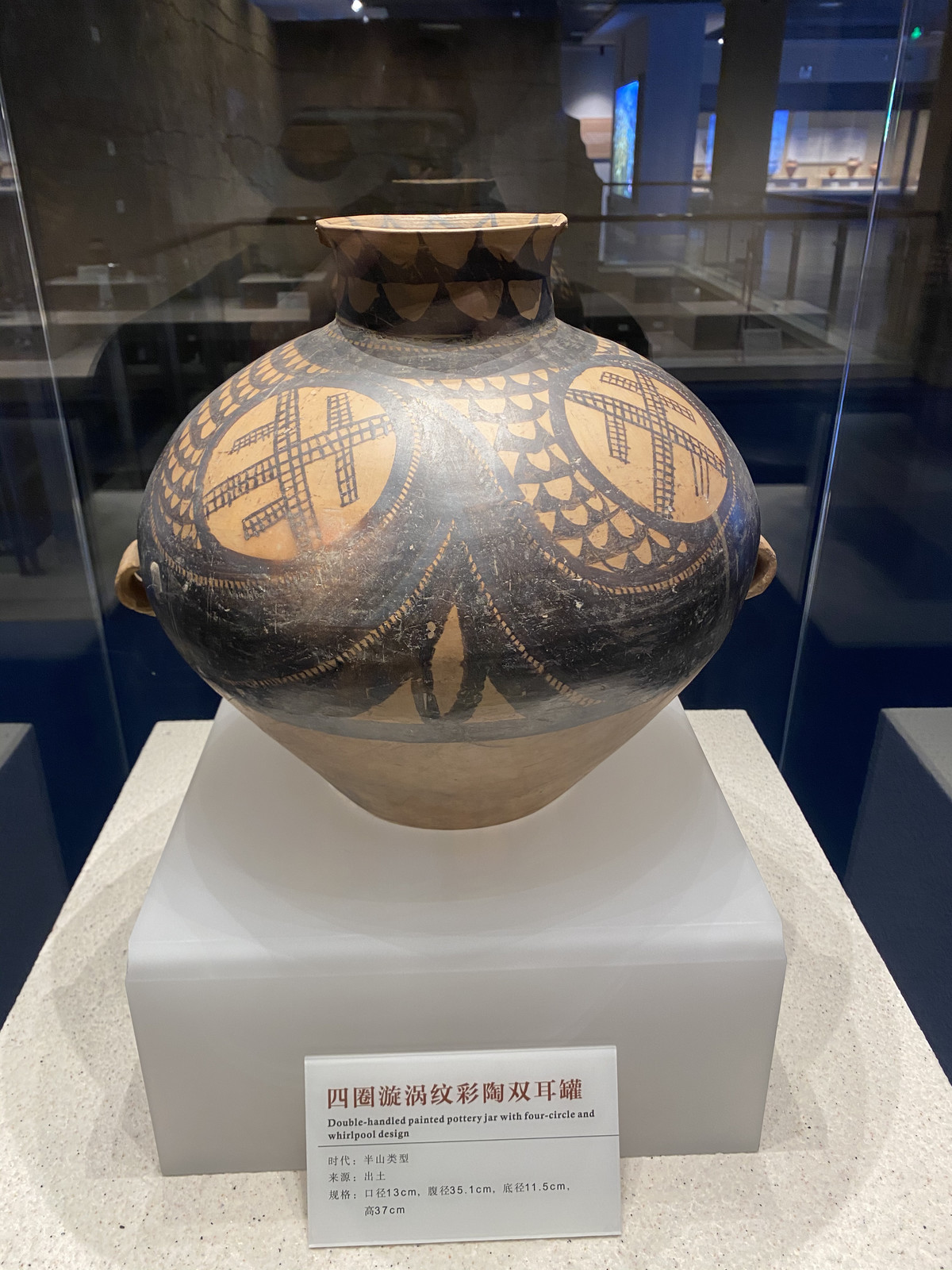 朗树德介绍,陶器上所绘的漩涡纹,一般为4个,呈对称状,也有少数陶器上绘有6个或者8个。记者看到,其中一件保存完好的半山类型的四圈漩涡纹彩陶双耳罐十分精美,高约37厘米,口径13厘米,腹径35.1厘米,底径11.5厘米。