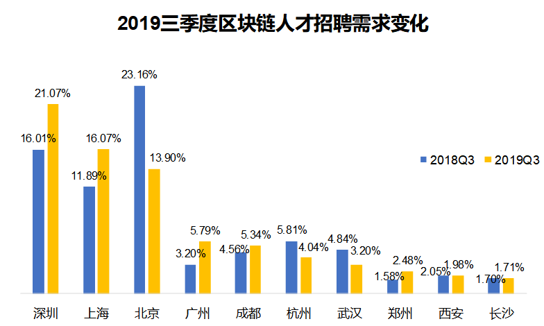 从2019年第三季度区块链招聘需求的城市分布来看,人才需求主要集中于一线和新一线城市,与人才求职城市分布对应,且人才供给明显更集中在一线城市。2019年三季度,区块链招聘需求城市分布中,深圳、上海、北京位于第一梯队,招聘人数占比分别达到21.07%、16.07%、13.9%,广州和成都紧随其后,分别占比5.79%、5.34%。其中深圳招聘需求占比较去年同期提高5.06个百分点,赶超北京,位居第一。