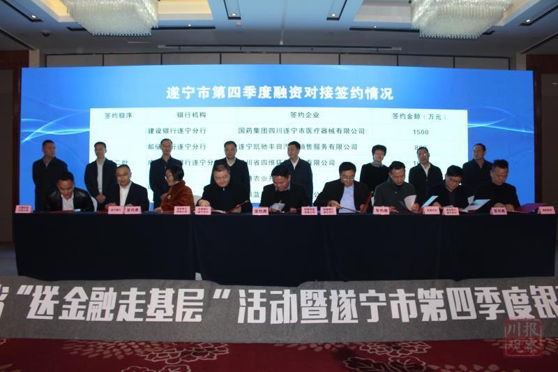 第一阶段,中国银行遂宁分行、遂宁农商银行、成都农商银行遂宁分行等金融机构与遂宁多家企业签订贷款协议,授信总金额达8.05亿元,其中,与遂宁高新区企业签订6.3亿元授信协议。现场签约仪式结束后,举行了遂宁“信融通”金融综合服务平台上线启动仪式。