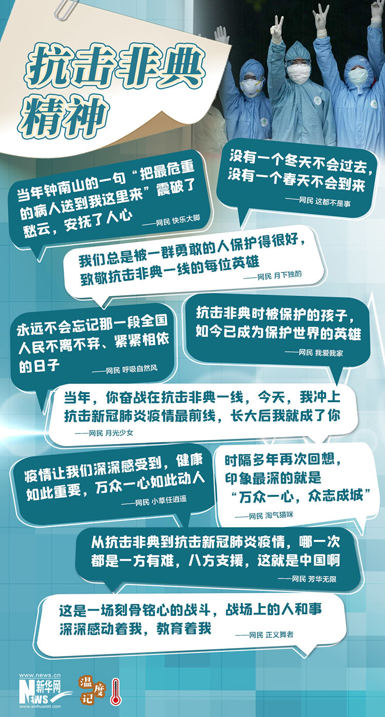 那一年,我们体会到了什么是万众一心。非典已经远去,但中国人守望相助的情怀从未改变。正如有的网民在社交平台上所说:“抗击非典时被保护的孩子,如今已成为保护世界的英雄”“当年,你奋战在抗击非典一线,今天,我冲上抗击新冠肺炎疫情最前线。”这就是代代传承的精神,这就是融入血脉的力量。这精神力量,让我们无所畏惧、坚强不屈,哪怕遇到惊涛骇浪,也必将穿越风雨、走向未来!(文字:冯文雅 海报设计:王晔)