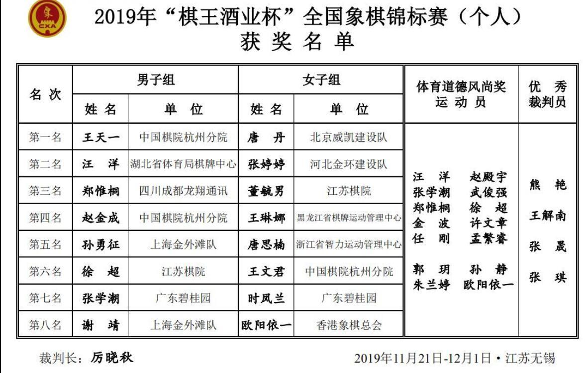 12月1日,一年一度的全国象棋个人赛在江苏无锡落幕,两位超级巨星王天一、唐丹以令人惊叹的表现,分别夺得男、女冠军,创造了新的纪录。