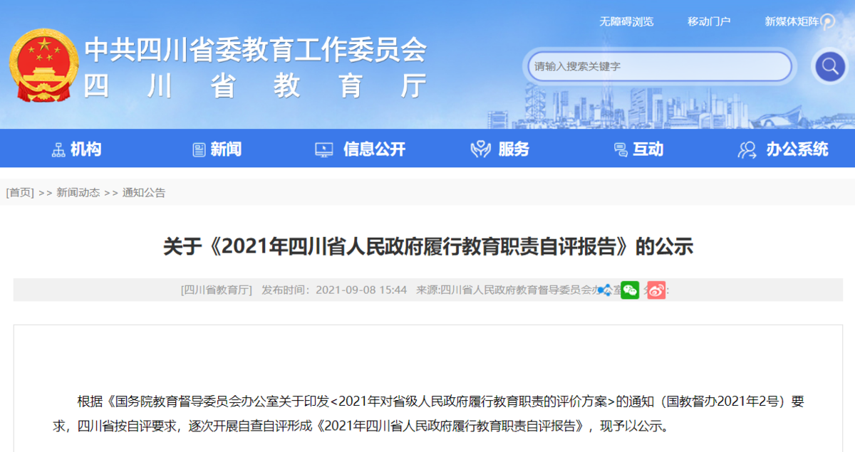 9月8日,四川省人民政府教育督导委员会办公室在四川省教育厅官方网站公示《2021年四川省人民政府履行教育职责自评报告》。