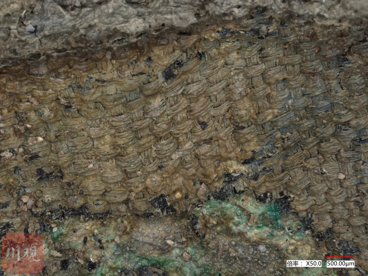 此次三星堆祭祀区启动新一轮考古发掘,四川省文物局专门邀请到了纺织品文物保护国家文物局重点科研基地主任周旸培训如何寻找丝绸。果然在祭祀坑启动发掘以后,考古人员在除5号坑以外的其它几座坑都发现了丝绸残留物或者丝蛋白信号。即使已经发掘出土了30多年的一、二号祭祀坑文物,考古人员也没有放过,他们在二号坑一块铜器灰烬堆积层以及四十余件器物上,都发现了丝绸残留,并且辨认出了平纹和斜编的组织结构。就在对这些丝绸残留物进行观测时,考古人员发现,丝绸上可能存在涂层。