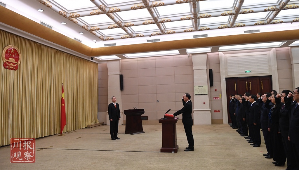 宣誓后,尹力作讲话,他要求全省国家工作人员永远铭记誓言,忠于宪法、勤勉尽责、清正廉洁,切实履行承诺,不辜负党和人民的重托。一要强化政治责任,在对党忠诚上作表率。要坚持以习近平新时代中国特色社会主义思想为指导,深入学习贯彻党的十九届四中全会精神,认真落实党中央关于建立不忘初心、牢记使命的制度安排,进一步增强“四个意识”、坚定“四个自信”、做到“两个维护”,把党的领导落实到政府工作各领域各方面各环节,促进全省经济高质量发展,为推动治蜀兴川再上新台阶不懈奋斗。二要弘扬法治精神,在依法行政上作表率。要牢固树立宪法意识,坚持弘扬法治精神,带头尊法学法守法用法,依照宪法和法律行使职权、履行职责、开展工作,进一步提高运用法治思维和法治方式深化改革、推动发展、化解矛盾、维护稳定、应对风险的能力,坚定不移把法治政府建设推向前进。三要坚持勤政为民,在实干担当上作表率。要认真贯彻以人民为中心的发展思想,围绕全省发展大局和中心工作,在各自岗位上履职尽责、开拓创新,真心实意为民办事、为民解忧、为民谋利,以实实在在的工作成效取信于民。四要锤炼过硬作风,在清正廉洁上作表率。要以“信念坚定、为民服务、勤政务实、敢于担当、清正廉洁”的好干部标准严格要求自己,注重加强和改进工作作风,力戒形式主义、官僚主义,着力养成在约束下办事、在监督下用权的习惯,做勤政廉洁的国家工作人员。