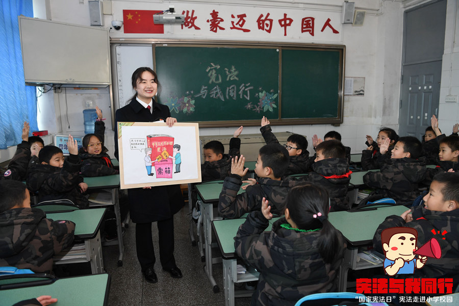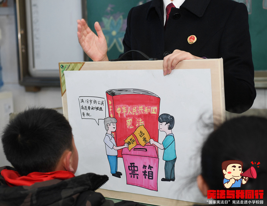 德阳市旌阳区检察院的检察干警余婷手持手绘的卡通图画,为德阳市华山路学校的孩子们讲解宪法知识。