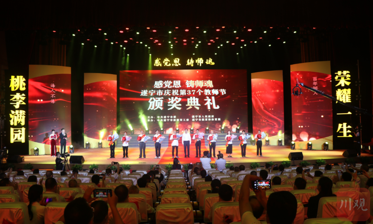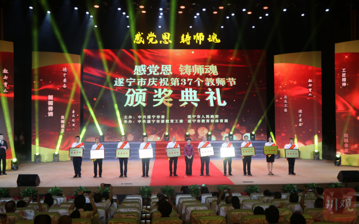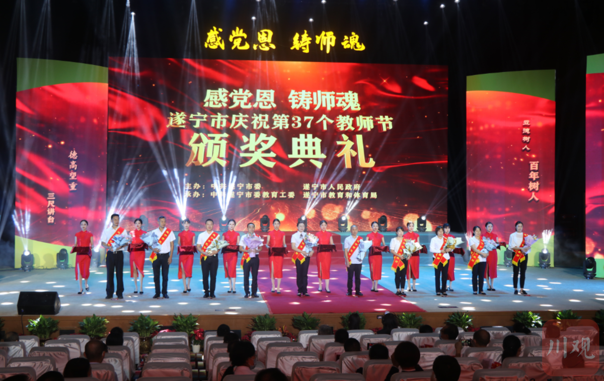 9月9日,遂宁市举行庆祝第37个教师节“感党恩 铸师魂”颁奖典礼,表扬奖励全市优秀教师、优秀教育工作者,弘扬尊师重教风气,激励全市教师、教育工作者不忘初心、牢记使命、奋发作为。