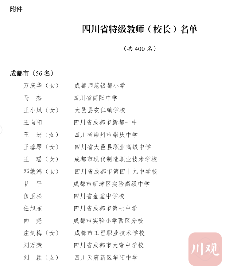 为大力弘扬尊师重教的良好风尚,表彰在中小学和中职教育教学中作出特殊贡献的教师、校长,进一步激励引导广大中小学和中职学校教师、校长投身教育、奉献社会,省政府决定授予万庆华等400名同志“四川省特级教师、校长”称号。