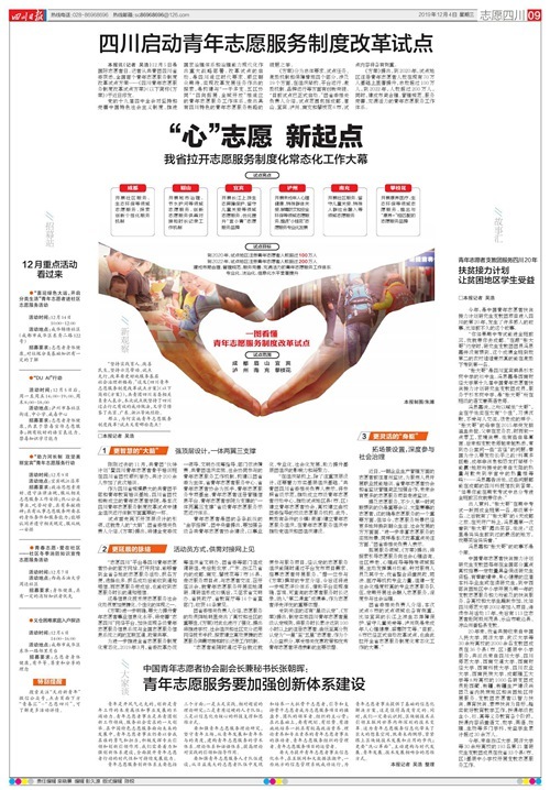 “坚持实践育人、改善民生,坚持示范带动、试点先行,改革要更好地服务基层社会治理新格局。”谈及《四川青年志愿服务制度改革试点方案》(以下简称《方案》),共青团四川省委相关负责人表示,本次试点既坚持了四川过去行之有效的成功做法,又学习借鉴了北京、广东、浙江等地经验。