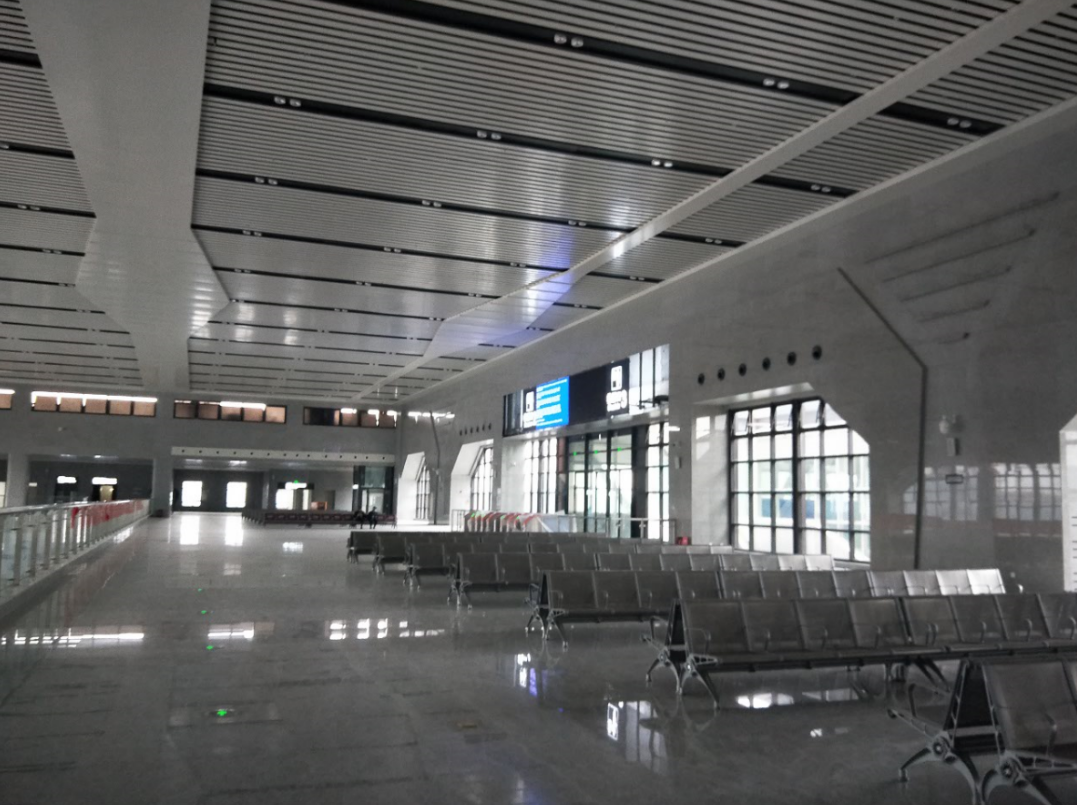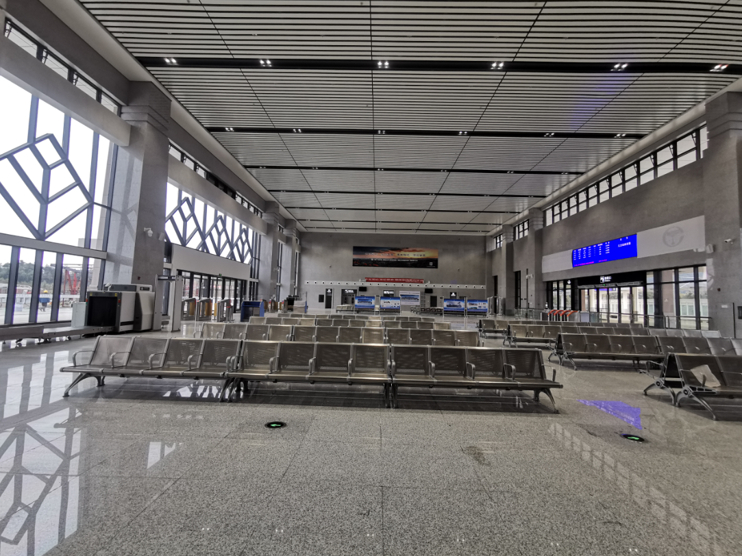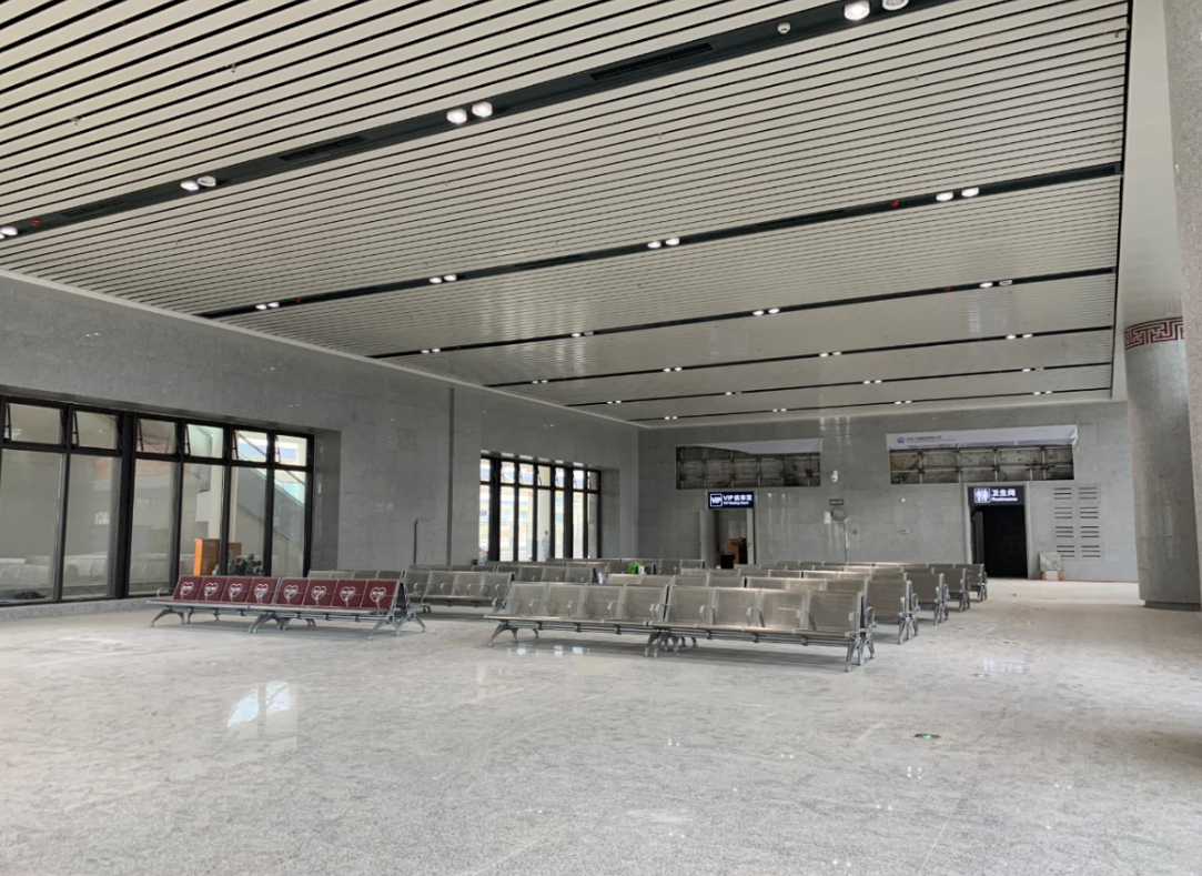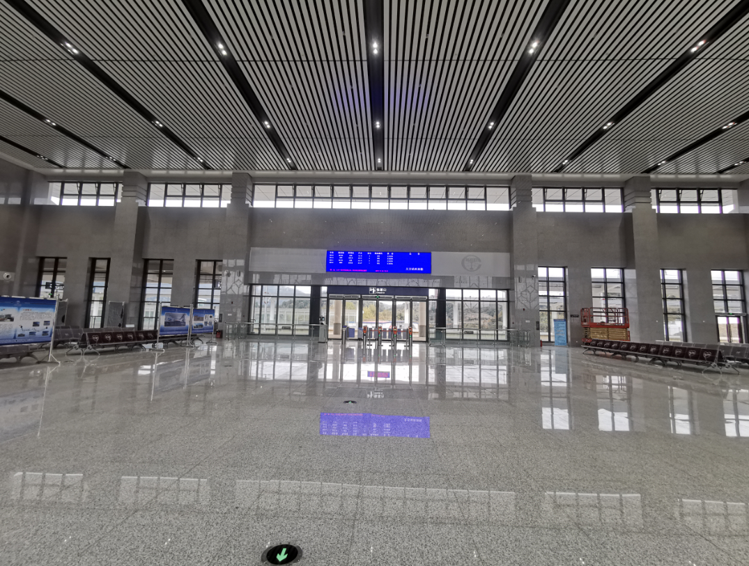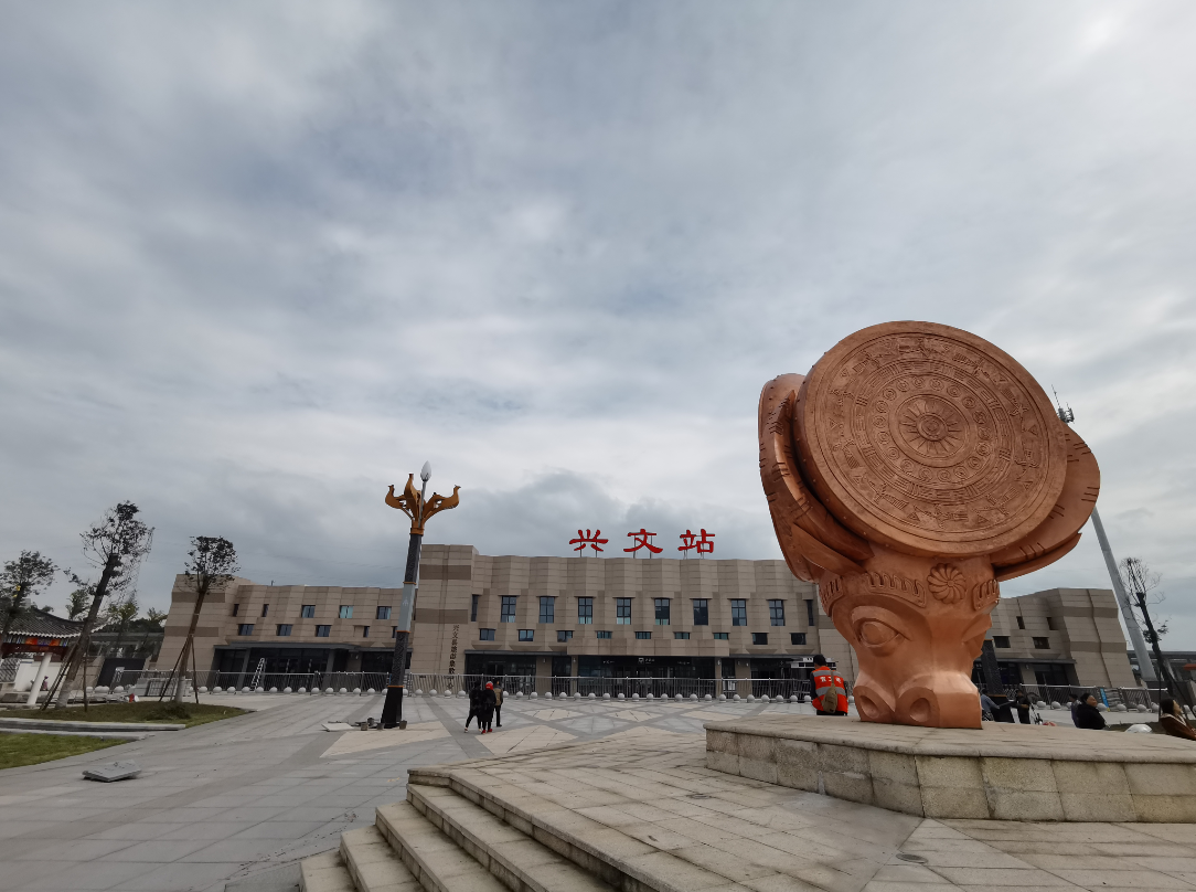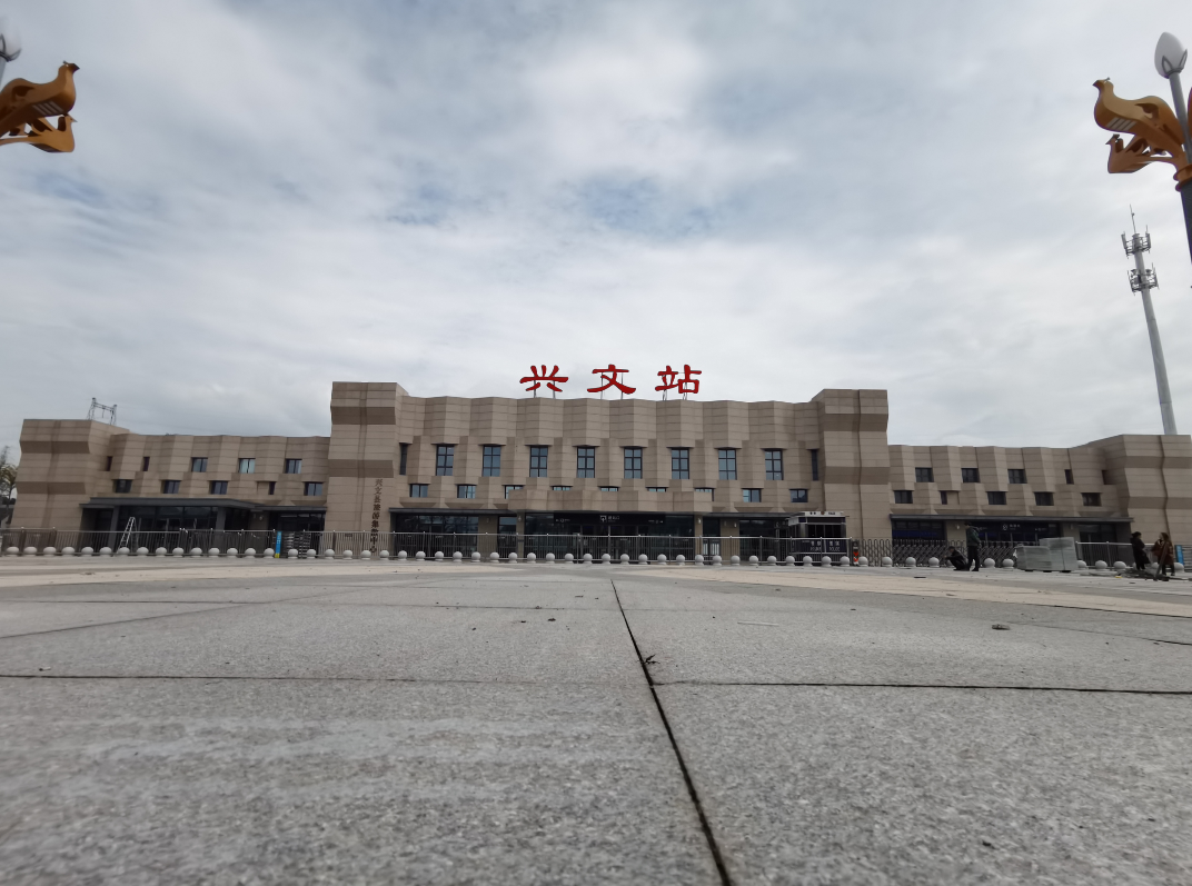 兴文站位于四川省宜宾市兴文县古宋镇同心村,其构思为“奇石涌浪”,通过几何形体的参差组合,将当地奇特的石海地貌元素融入站房设计,抽象出奇石堆叠翻涌的意向。站房中间高、两侧低,立面的轮廓线富有变化、层次分明,既有层波叠浪的整体气魄,又有奇石刚劲有力的细部特征。车站候车室面积1000平米,旅客最大聚集人数400人,候车室座位256个。