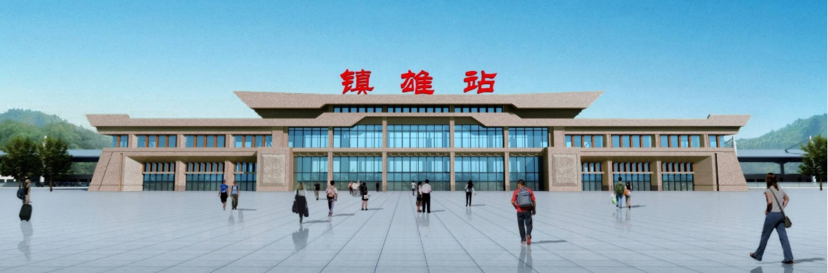 镇雄站位于云南省镇雄县以勒镇。站房设计以“镇守雄关”为主题,外立面整体效果庄重大气,檐口轮廓张弛有力,外墙细部壁画提炼了当地景点文俗和传说。站房建筑面积5999平方米,地面二层。