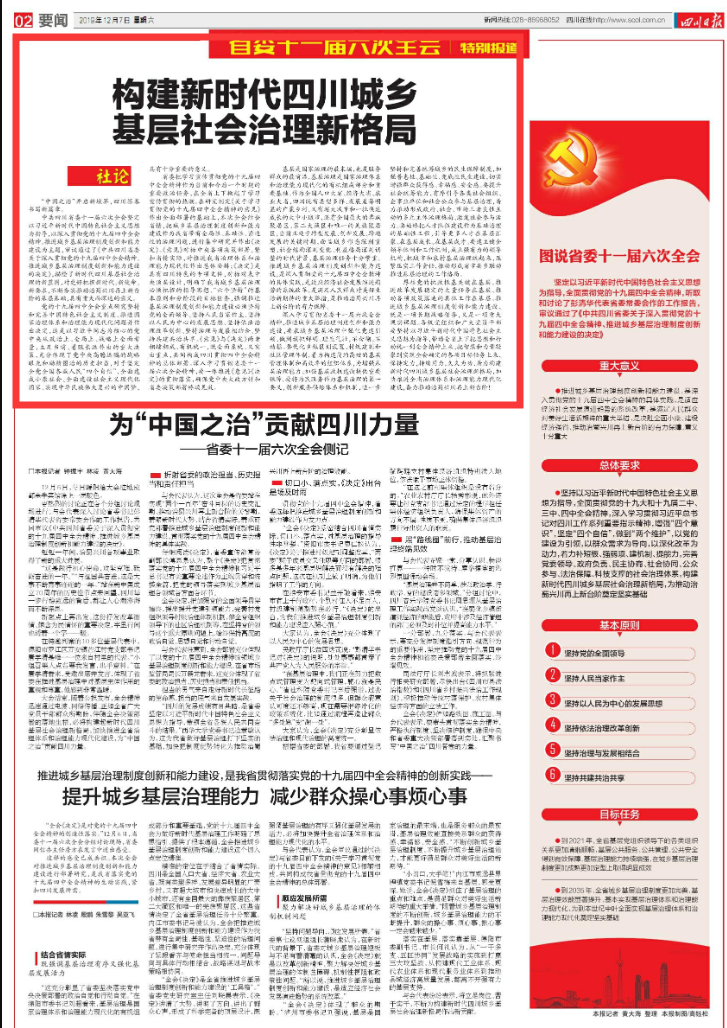 中共四川省委十一届六次全会坚定以习近平新时代中国特色社会主义思想为指导,以深入贯彻党的十九届四中全会精神、推进城乡基层治理制度创新和能力建设为主题,审议通过了《中共四川省委关于深入贯彻党的十九届四中全会精神、推进城乡基层治理制度创新和能力建设的决定》,描绘了新时代四川基层社会治理的新蓝图,对更好把握新时代、新使命、新要求,不断夯实推动治蜀兴川再上新台阶的基层基础,具有重大而深远的意义。