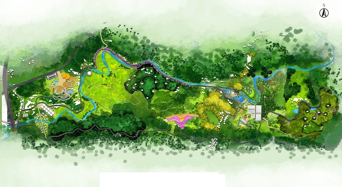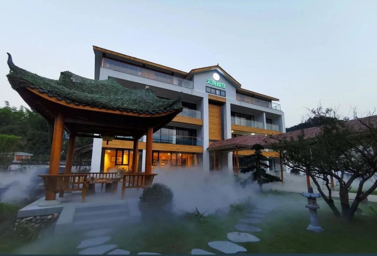 雅安凤鸣农业科技示范基地内,白墙灰瓦,茶树环绕。基地位于风景秀丽的桂花村,占地面积340亩,是雅安市农业和水务投资有限公司打造的农旅融合示范基地。依托当地茶叶、蔬菜、水产等优势产业基础,借助地处雅安市“一核一环一芯”城市战略“一芯”腹地的区位优势,基地目前已建成设施农业示范区、校企合作示范区、农耕体验示范区、粮油种植示范区、林下种植示范区、水产养殖示范区、农旅融合示范区等。
