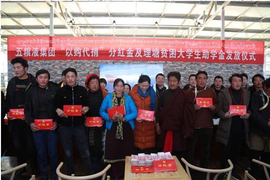 贫困户德西一家8口领到了分红金3.2万元,热泪盈眶的德西握住五粮液股份公司工会主席杨韵霞的手激动地说:“共产党亚莫热(藏语:很好的意思,五粮液噶真切!(藏语:感谢的意思)”。近日,五粮液集团“以购代捐”分红金及理塘贫困大学生助学金发放仪式在理塘举行。