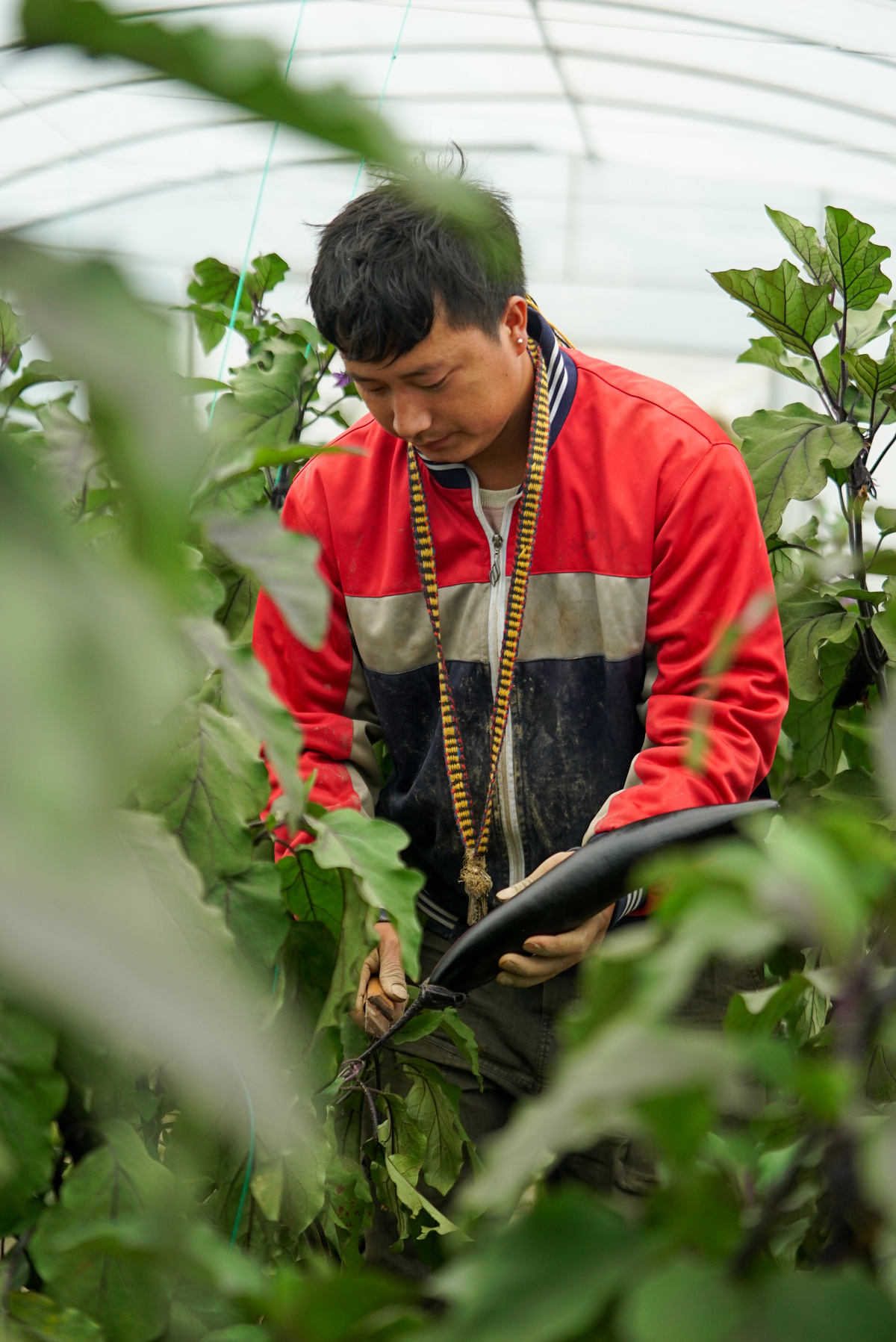 村民在蔬菜大棚内摘茄子