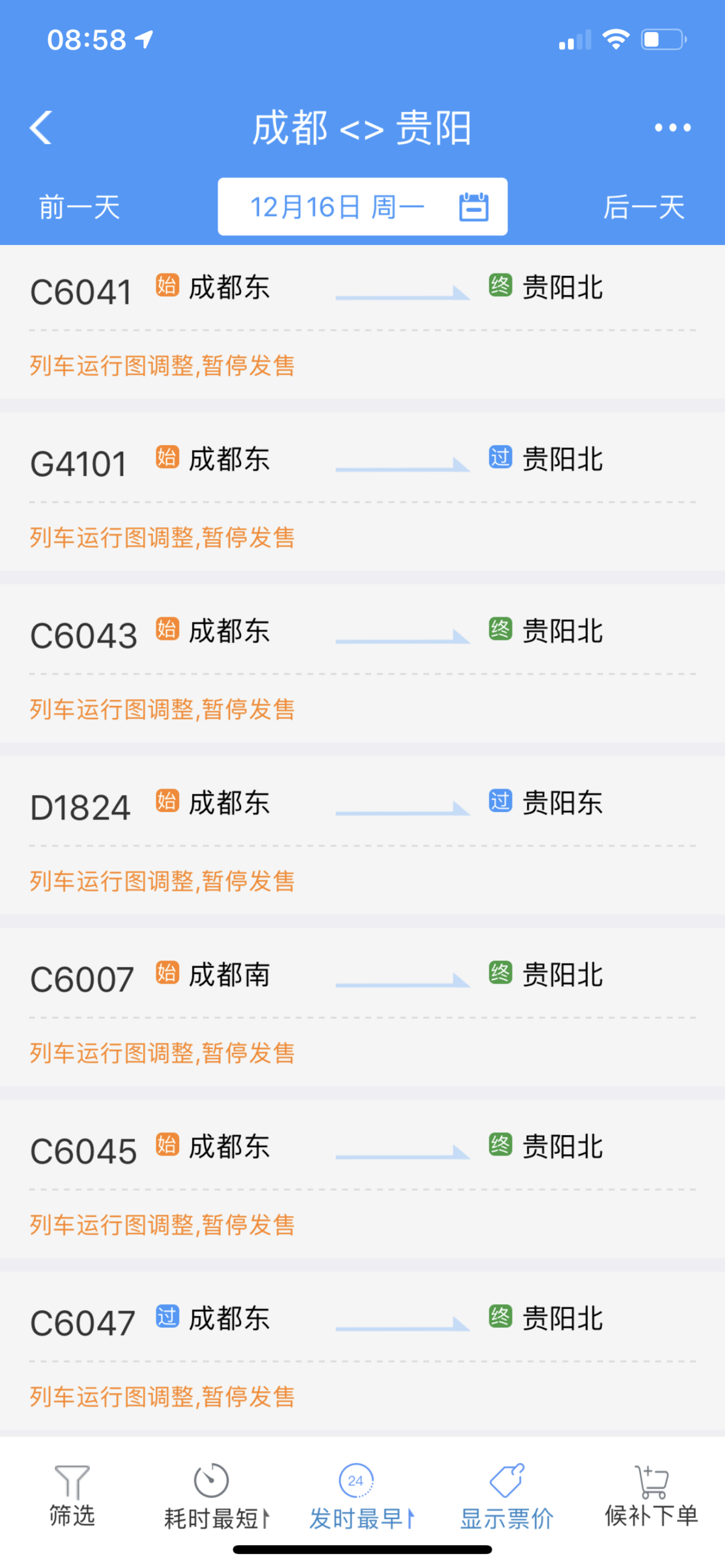 有网友发现,12306网站上成都和贵阳之间的动车信息有异常,从12月16日(下周一)起数趟动车显示“列车运行图调整,暂停发售”信息,这与此前有新铁路线开通的情况类似,很可能意味着成贵高铁将从12月16日开通。