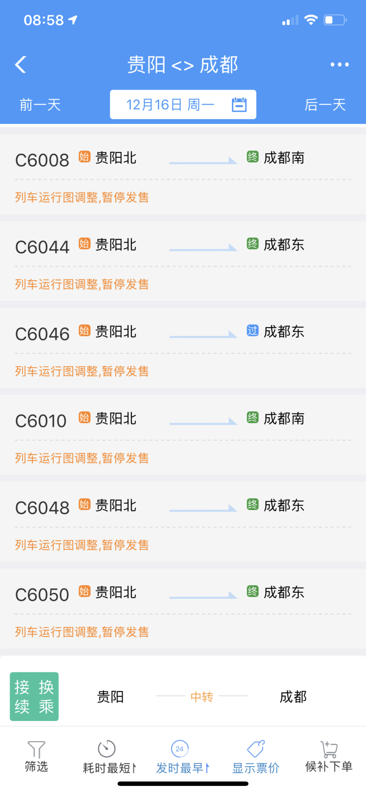 从待开的车次信息来看,有C字头、D字头、G字头,成都的始发、终到站有成都东、成都南,而贵阳的始发、终到站为贵阳北,长途过路车站为贵阳东。