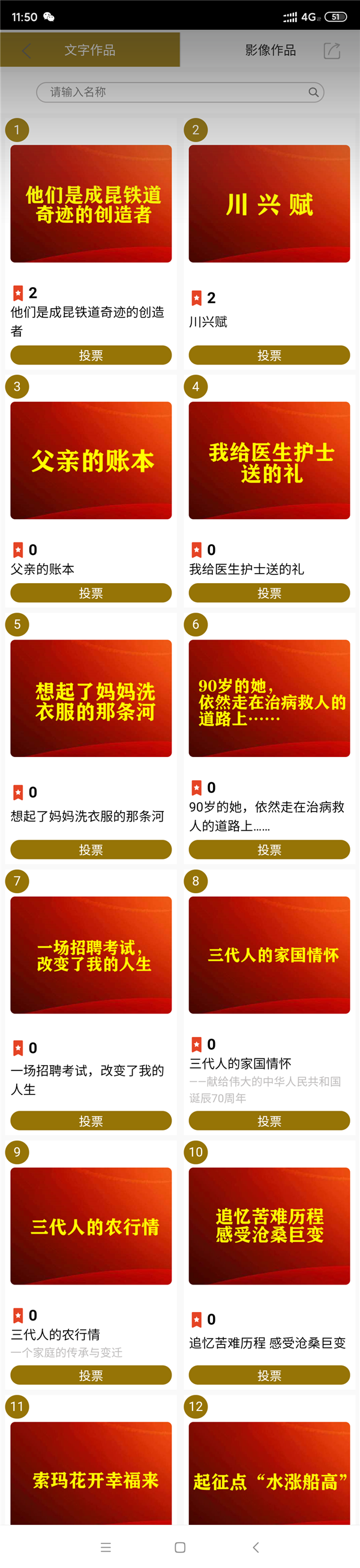 投票方式:即日起至12月18日24:00,公众在手机上下载安装“川报观察”客户端,在首页活动专区或通过时政频道进入“忆沧桑·记奋斗·颂辉煌——庆祝中华人民共和国成立70周年”文字和影像作品征集活动专区,欣赏作品并投上您宝贵的一票。根据规则,每位参与投票者(一个ID)在一天内可为自己喜爱的多件作品投票,投票作品数量不设上限,但每天只能对同一件作品最多投票2次(点击一次“投票”算一次)。