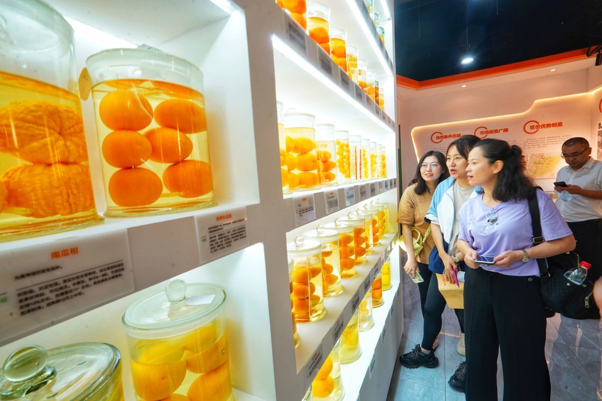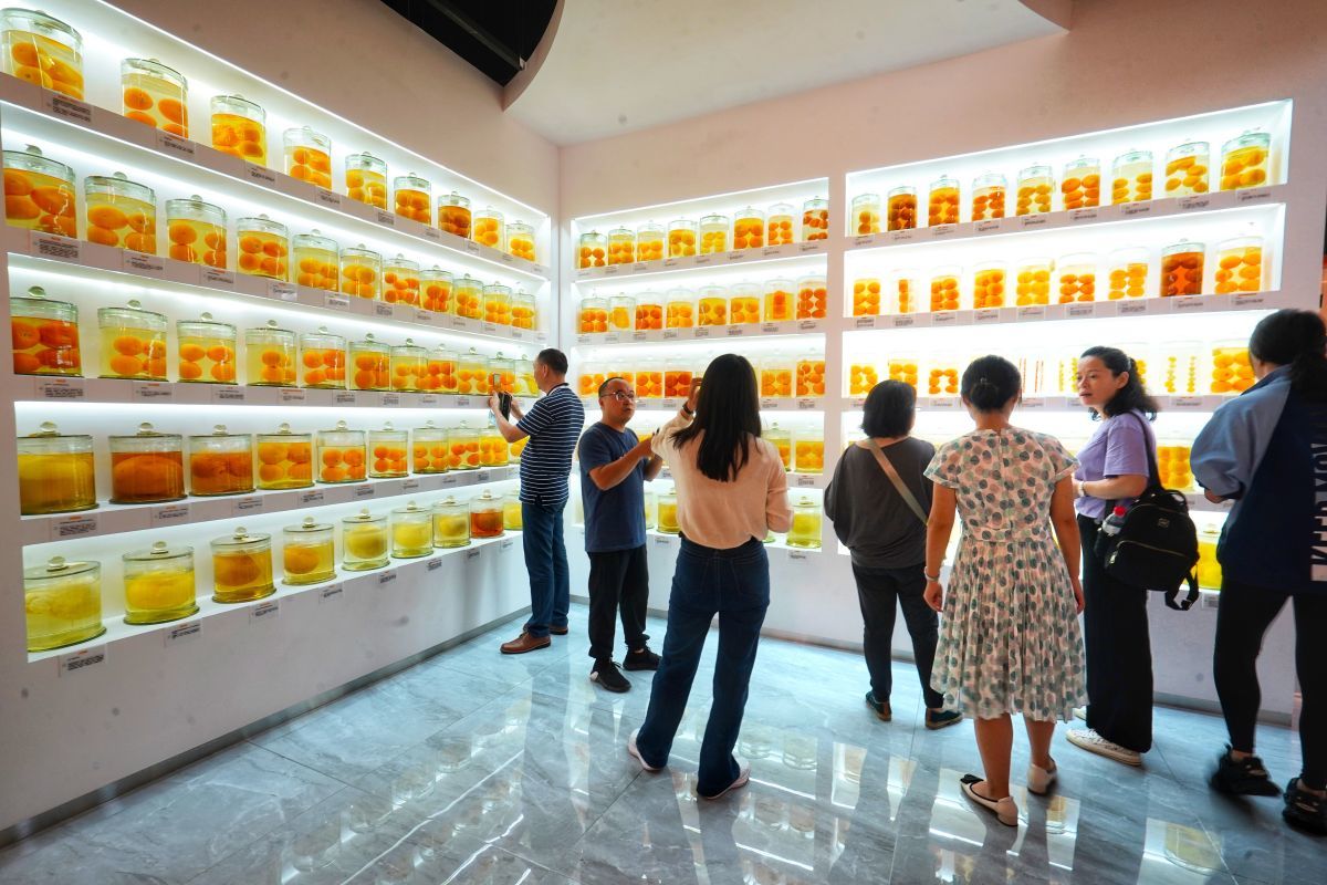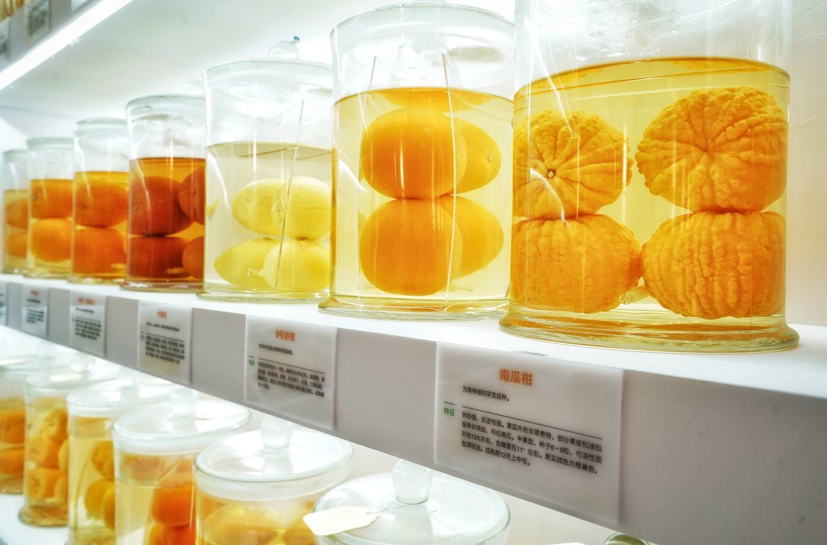 馆内有一处尤其引人瞩目,那是一整面墙的柑橘标本,展示的柑橘品种多达130多种,其中近60种来自青神当地。“你看这个特别小的柑橘叫做金豆,是现存最小的柑橘。”记者现场目测,金豆的直径最多1厘米左右,主要做药用和泡酒;而现场也有个头巨大的琯州蜜柚,据悉最重可达2公斤。
