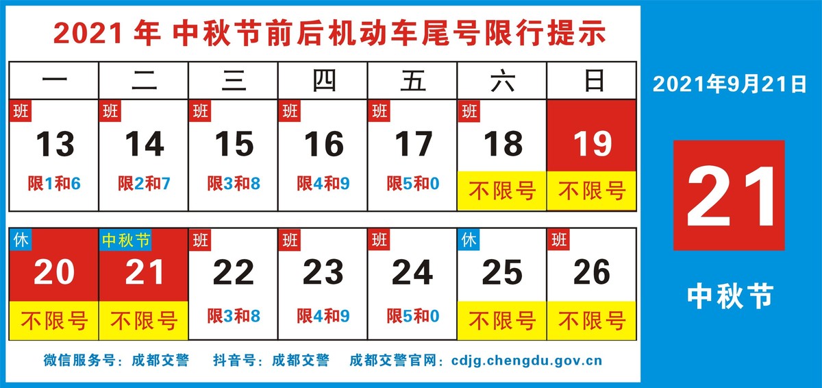 9月14日,记者从成都市交管局获悉,当日,成都市交管局发布中秋节前后成都机动车尾号限行政策。根据政策,2021年“中秋节”假期为9月19日至21日(3天),期间机动车尾号不限行。
