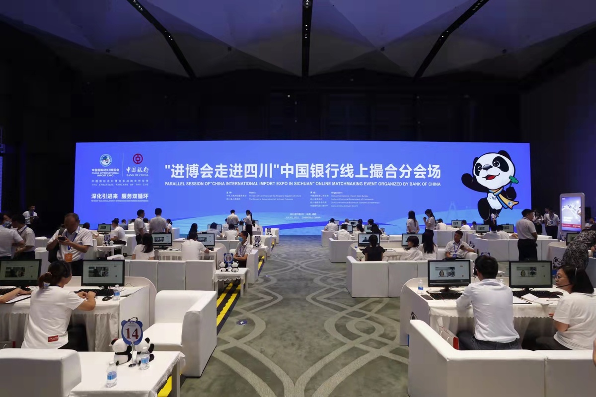 今年7月,以“深化引进来 服务双循环”为主题的进博会走进四川投资推介对接会在成都举行。作为进博会唯一战略合作伙伴,中国银行独家支持、全程深度参与,并在投资推介对接会中成功举办线上撮合活动,60余组中外企业进行了线上磋谈,这些企业来自美国、德国、韩国、意大利、俄罗斯、新西兰、日本、巴基斯坦等十余个国家,行业涉及批发零售、设备制造、航空航天、汽车制造、建筑业、食品加工等,最终达成合作意向28项,达成意向金额超百亿美元。