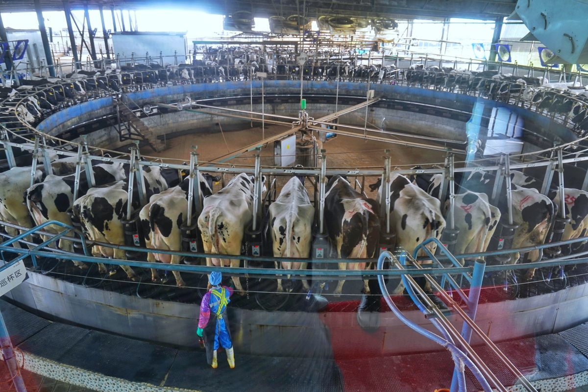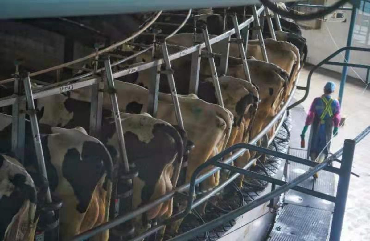 据悉,这台挤奶机每转一圈,大概需要10分钟左右。仅仅一个小时,就可完成500多头奶牛的挤奶,8名操作工就可完成3500头奶牛的一次挤奶。“为了避免污染,通常每头牛的头三泵奶我们都不要,一头牛大概每天挤3次奶,可产33斤牛奶。”封闭式的机械化挤奶既提升了效率又保障了安全,目前洪雅现代牧场可日产鲜奶100吨左右,这些鲜奶被送到新希望、蒙牛等乳制品”大厂“,被加工成成品奶,从而实现年销售收入1.5亿元。