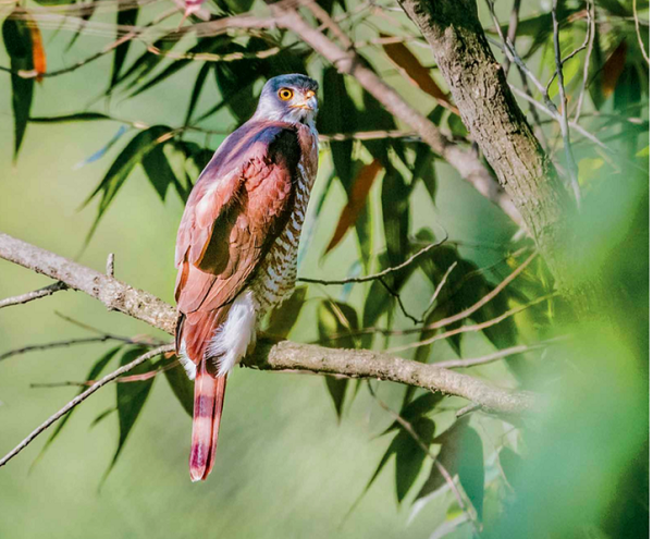 留鸟,俗名凤头雀鹰,体长约42厘米,是中型猛禽,喜在丘棱森林中活动,主要捕食两栖、爬行类、中小型哺乳动物。它的巢在大树顶部的浓荫中,不易发现。一般只有两、三枚卵。人如果靠近它的巢区会受到攻击和驱赶。是国家二级保护鸟类,它被列入了世界自然保护联盟2012年濒危物种红色名录低危类。