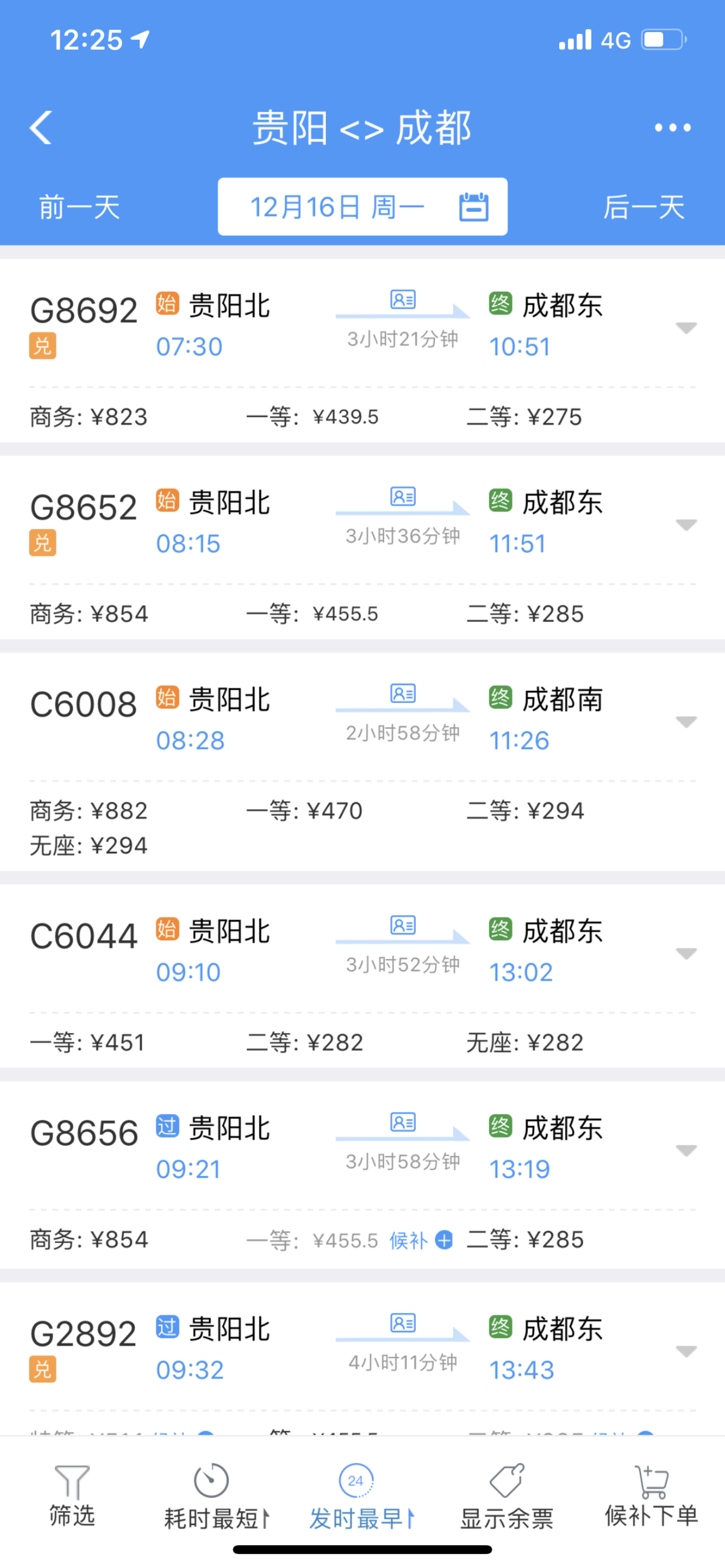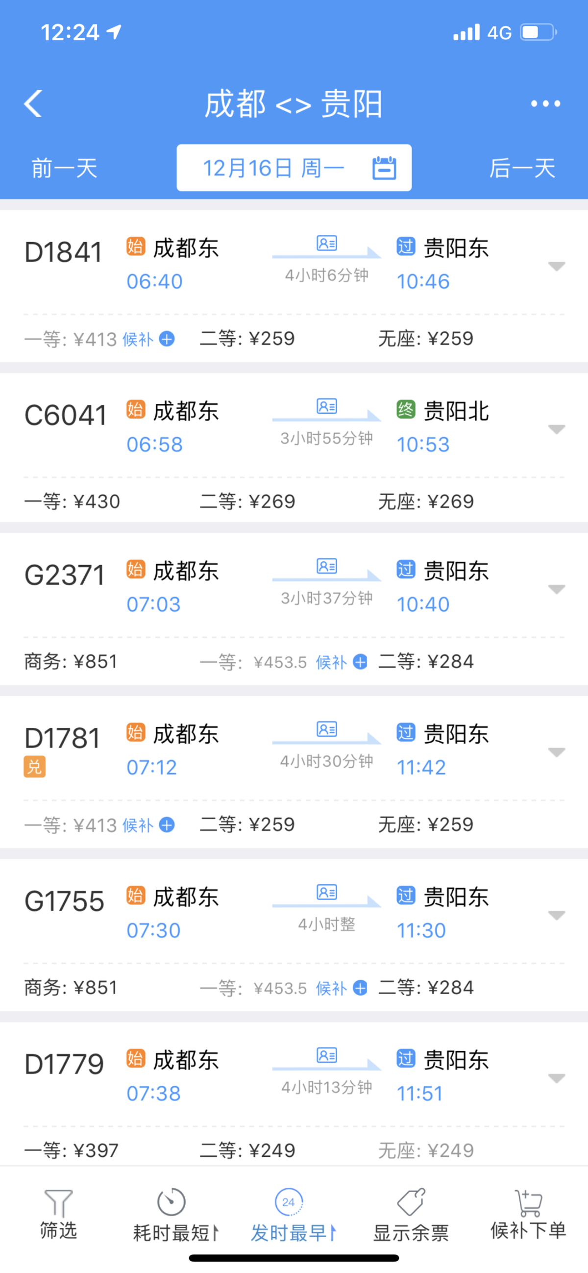 12月14日中午12时,铁路12306官方售票渠道开始发售成贵高铁动车票。记者查询发现,最早发车是C6041次动车,票价一等座座430元、二等座269元。