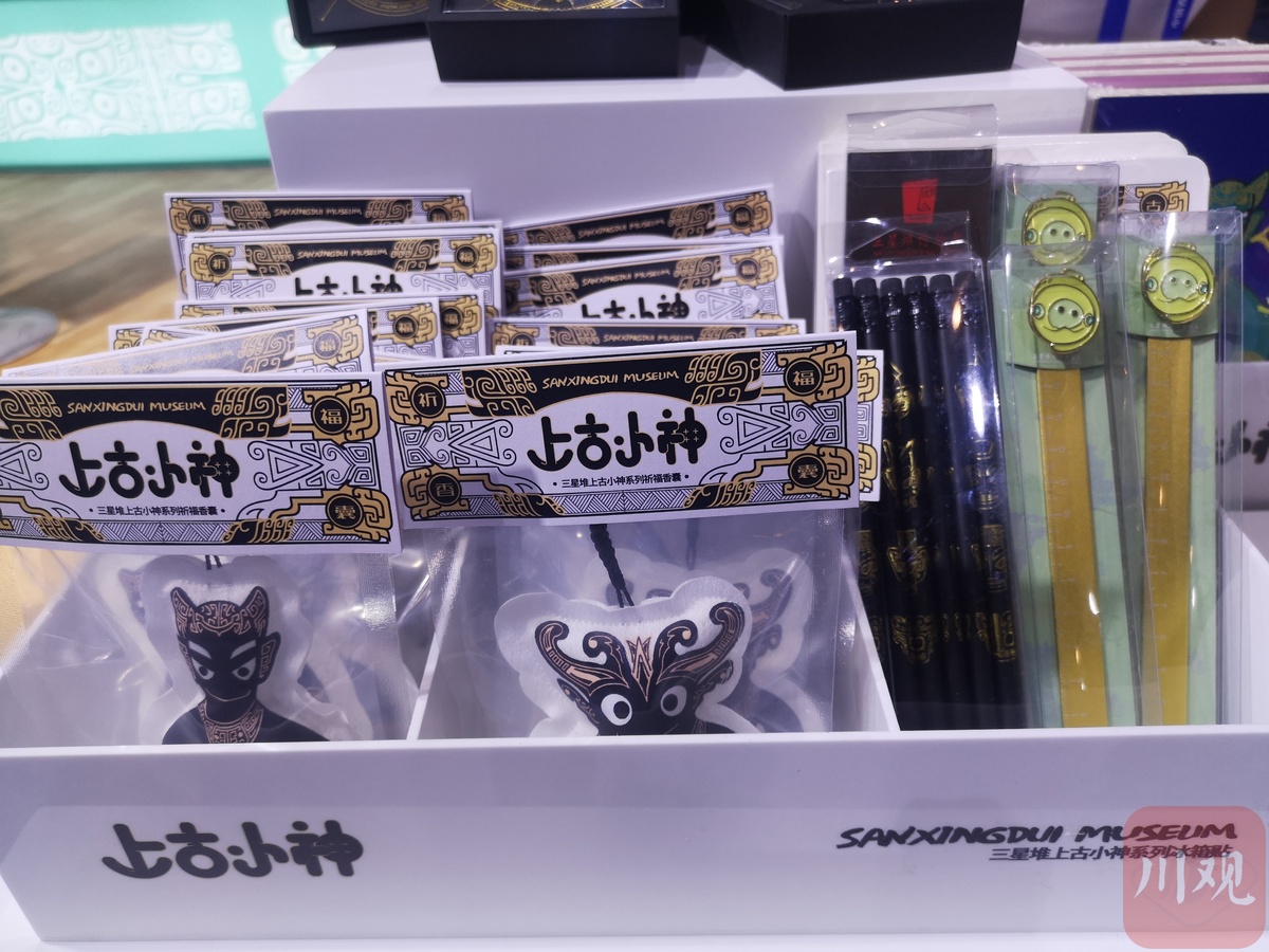 三星堆博物馆文创馆负责人钟科进介绍,三星堆博物馆目前开发了400多种文创产品,本次西博会,共有30多种亮相德阳馆,包括冰箱贴、祈福香囊、直尺、铅笔、笔记本、盲盒、月饼、口罩等。